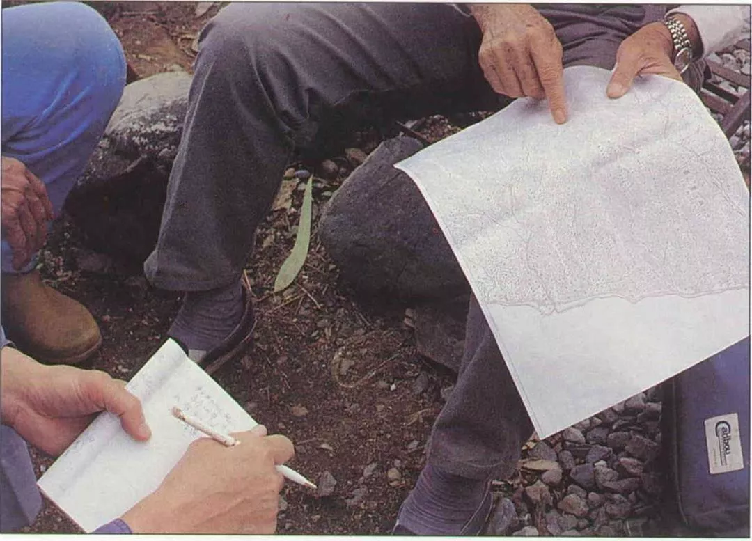 正式上山尋找古道之前,楊南郡先到古道沿途的聚落採訪。右圖他請教曾在該山區活動的住民,並以等高線圖(左圖)詢問路況。