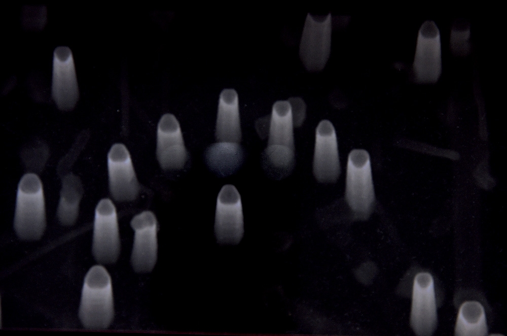 成長中的磷化鎵奈米線,在顯微鏡下,有如一幅幅藝術品。圖為美國IBM華生中心送給周苡嘉的紀念禮物。