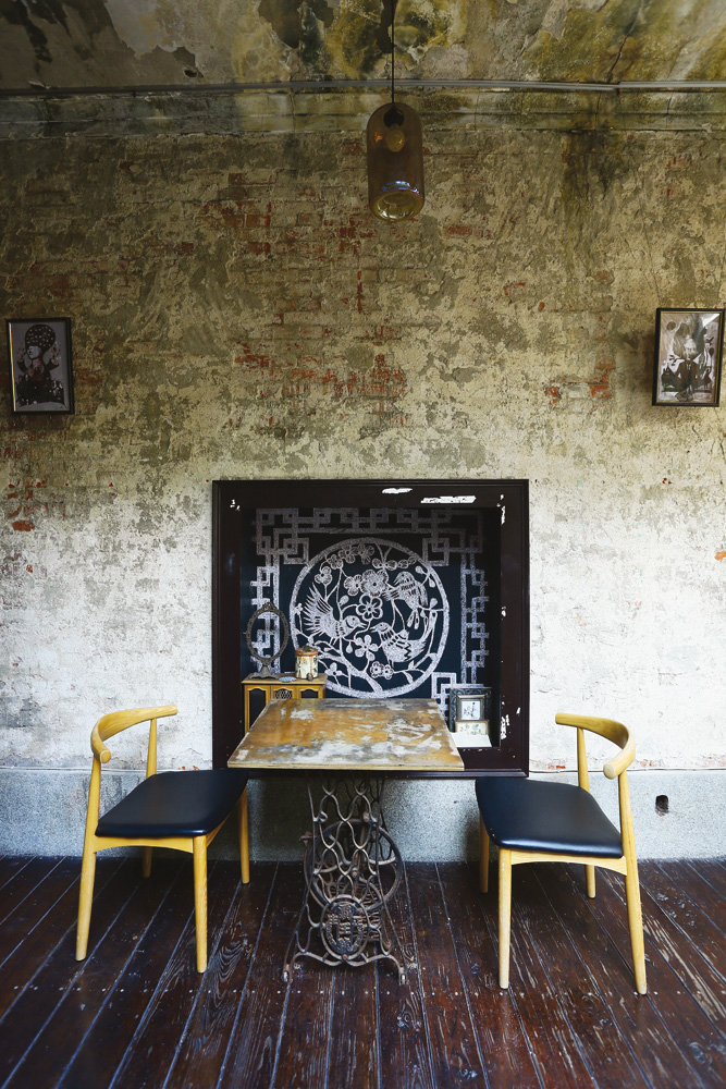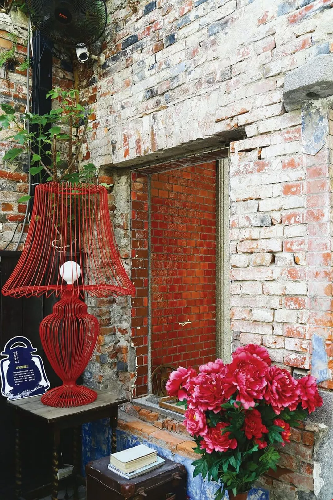 百年老宅台式紅磚裸牆,老式裁縫機 桌面混搭中式窗框,業者保存老屋元 素,融入時尚設計概念。