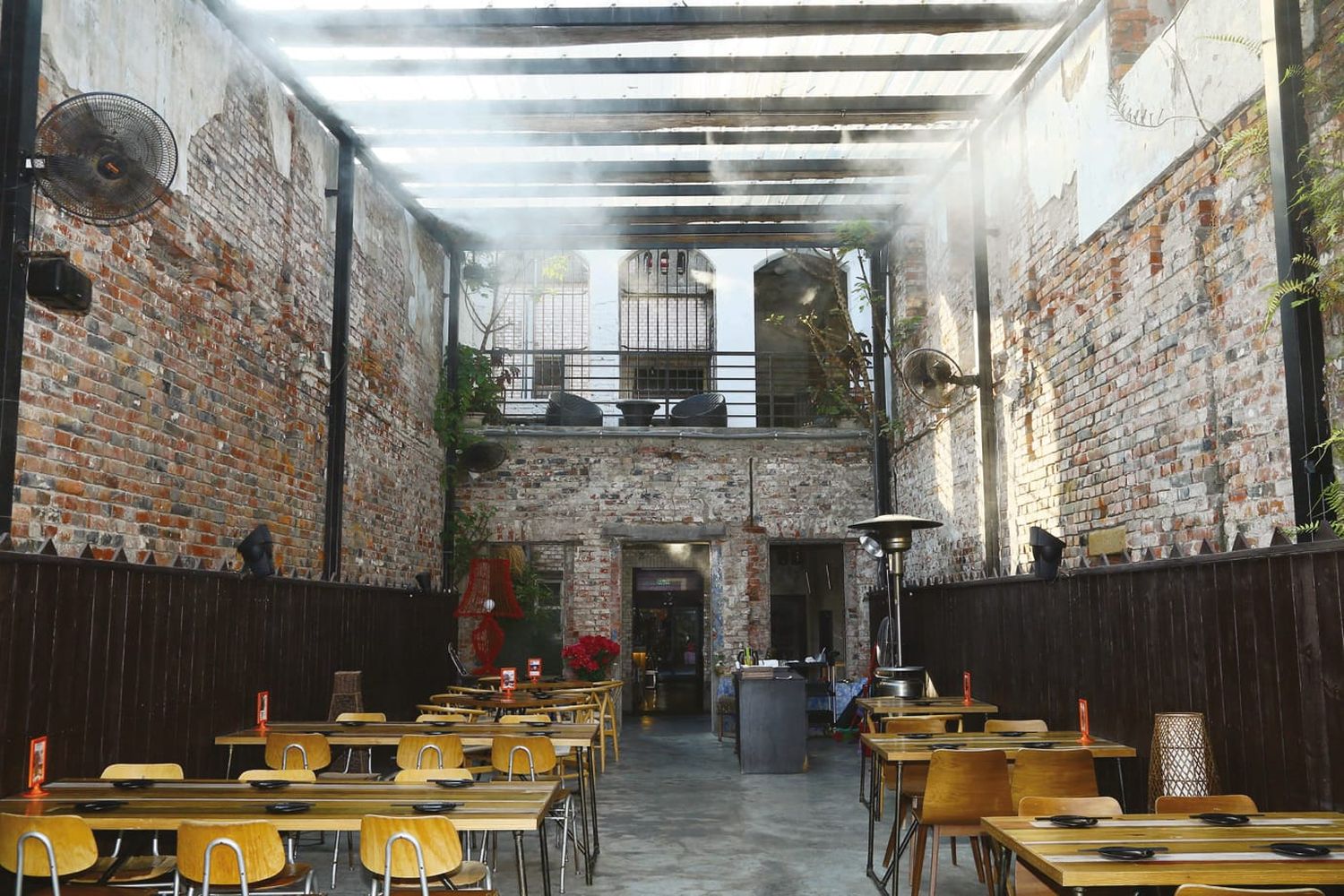 百年老宅台式紅磚裸牆,老式裁縫機桌面混搭中式窗框,業者保存老屋元素,融入時尚設計概念。