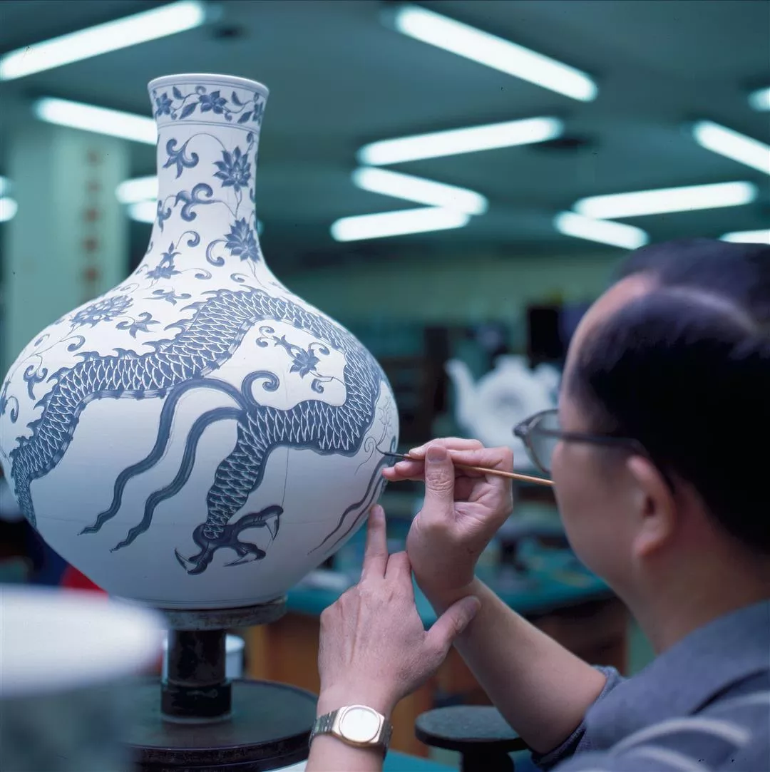 彩繪師傅正為青花瓷瓶繪圖上色。(歐陽芷汀/楊永山/鐘永和/趙蘊嫻)