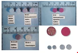 台北市警局查獲的搖頭丸中,發現多摻雜有其他添加物像是安非他命、咖啡因、K他命等,形狀不一而足,各式的色彩刺激著人們的好奇心。(翻拍自台北市警局鑑識中心檔案資料)