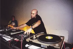 來自西班牙的首席Techno電子音樂DJ Angel Molina,在簡單搭設的舞場裡與一群人同樂,電子樂的魅力不容小覷。(林格立攝)