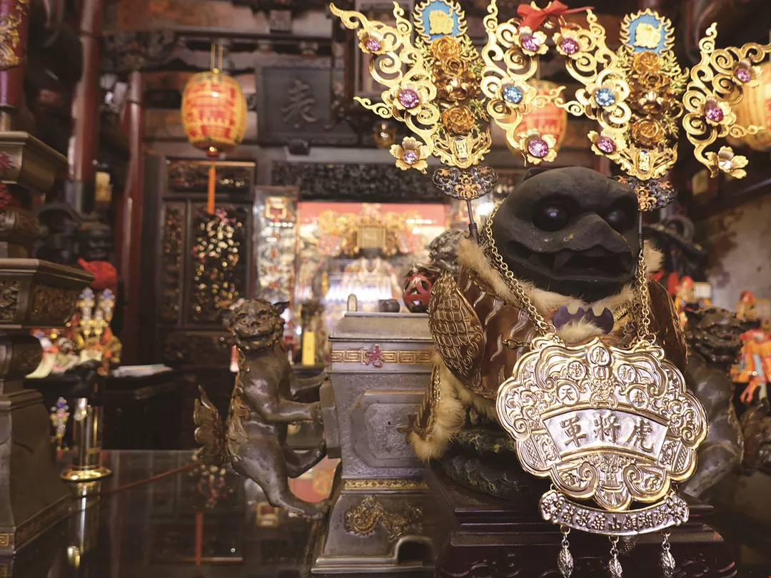 豪氣端坐殿上的「新港奉天宮」虎爺,身穿華麗帥氣的戰甲、頭頂閃耀奪目的金光,充滿生氣又威風凜凜。