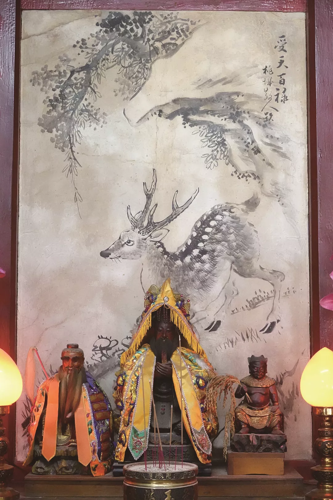 前殿左側的巨幅壁畫,畫面左側可見低矮竹篙厝,順著小廟飄散的縷縷香煙。連結北門車站與阿里山小火車,也串聯舊時攤販與當代的市場情境,娓娓道出老廟的發展歷史與北門鄰里的關聯性。