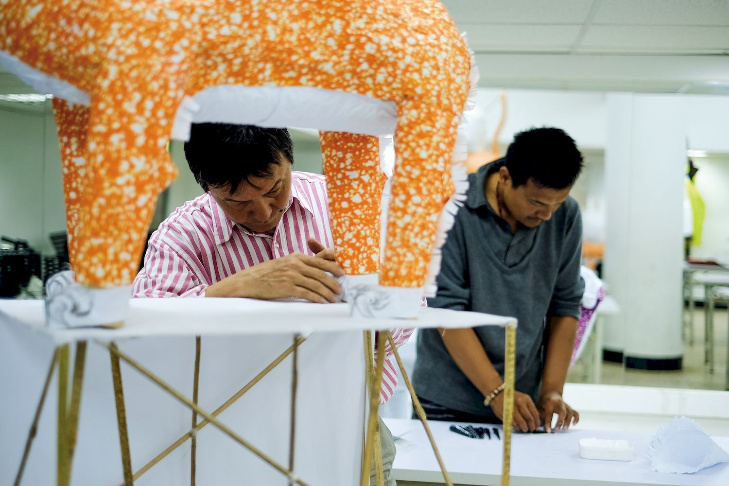 然而,如果只是一味以紙材包裝外觀,作品將會流於單調。王旭昇表示,糊紙藝師除了要會紮竹篾、會畫圖之外,還得要會縫、會編織,因為糊紙過程中,偶爾也會用到布料、亮片等其他材料。