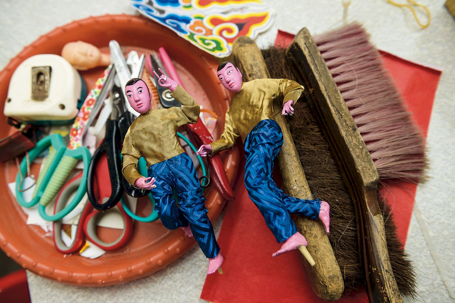 譬如,做人偶的鬍子,有些人是剪張黑紙貼在鼻子下方,看上去就是一張黑紙。王旭昇拒絕如此隨波逐流,他說,即便改用塑膠繩抽絲,也要做出跟古法以棉線或細麻繩塞進糊紙後,鬍鬚呈現絲絲分明的效果。