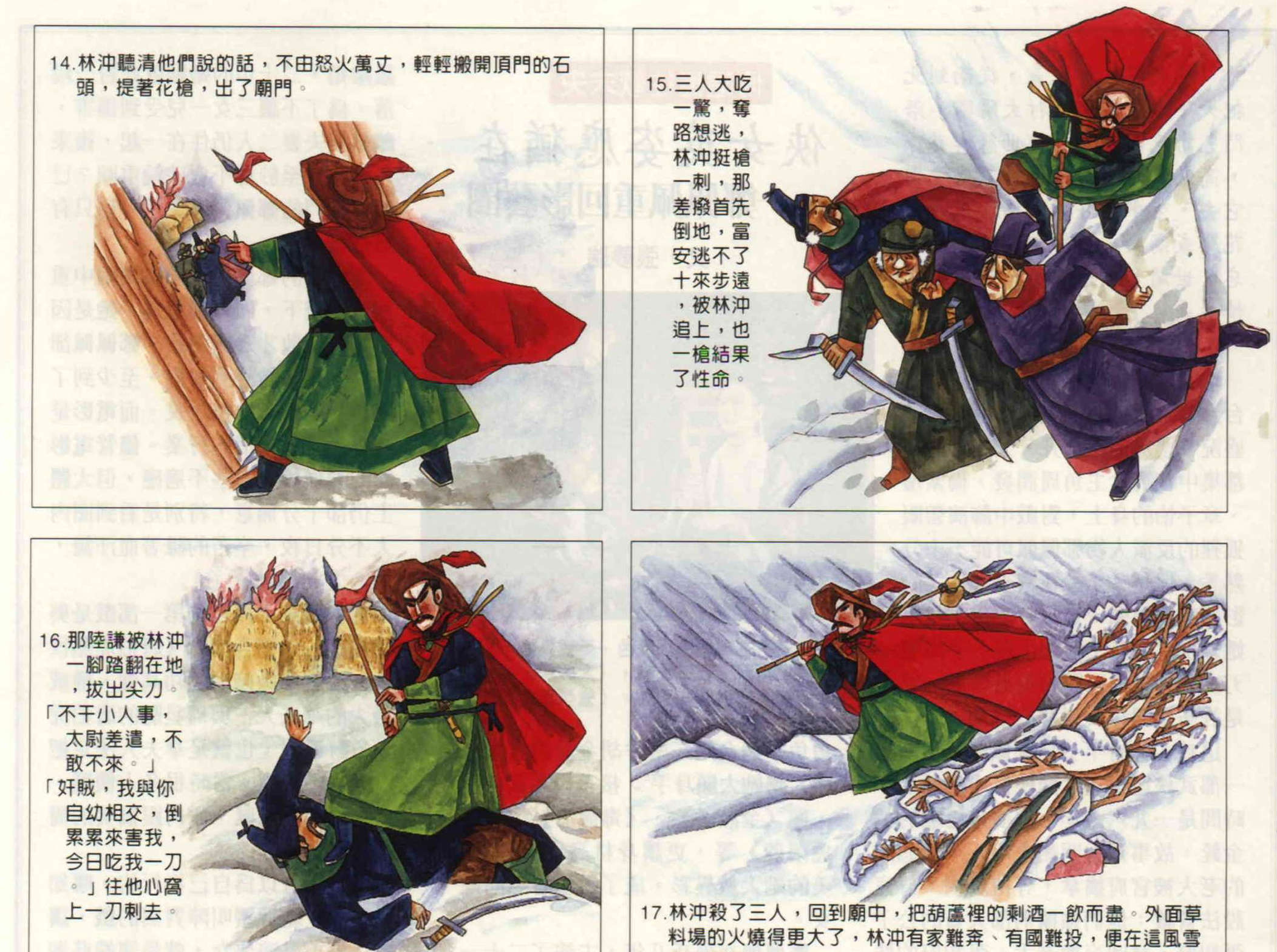 17.林沖殺了三人,回到廟中,把葫蘆裡的剩酒一飲而盡。外面草料場的火燒得更大了,林沖有家難奔、有國難投,便在這風雪夜上了梁山。
