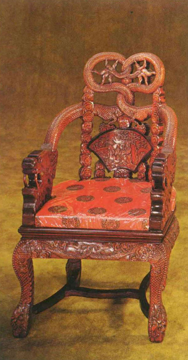 這把龍椅是仿造清廷皇帝御用座椅的花紋設計而成,兩邊椅把是龍頭,椅背則由龍身盤繞而成。(華台)