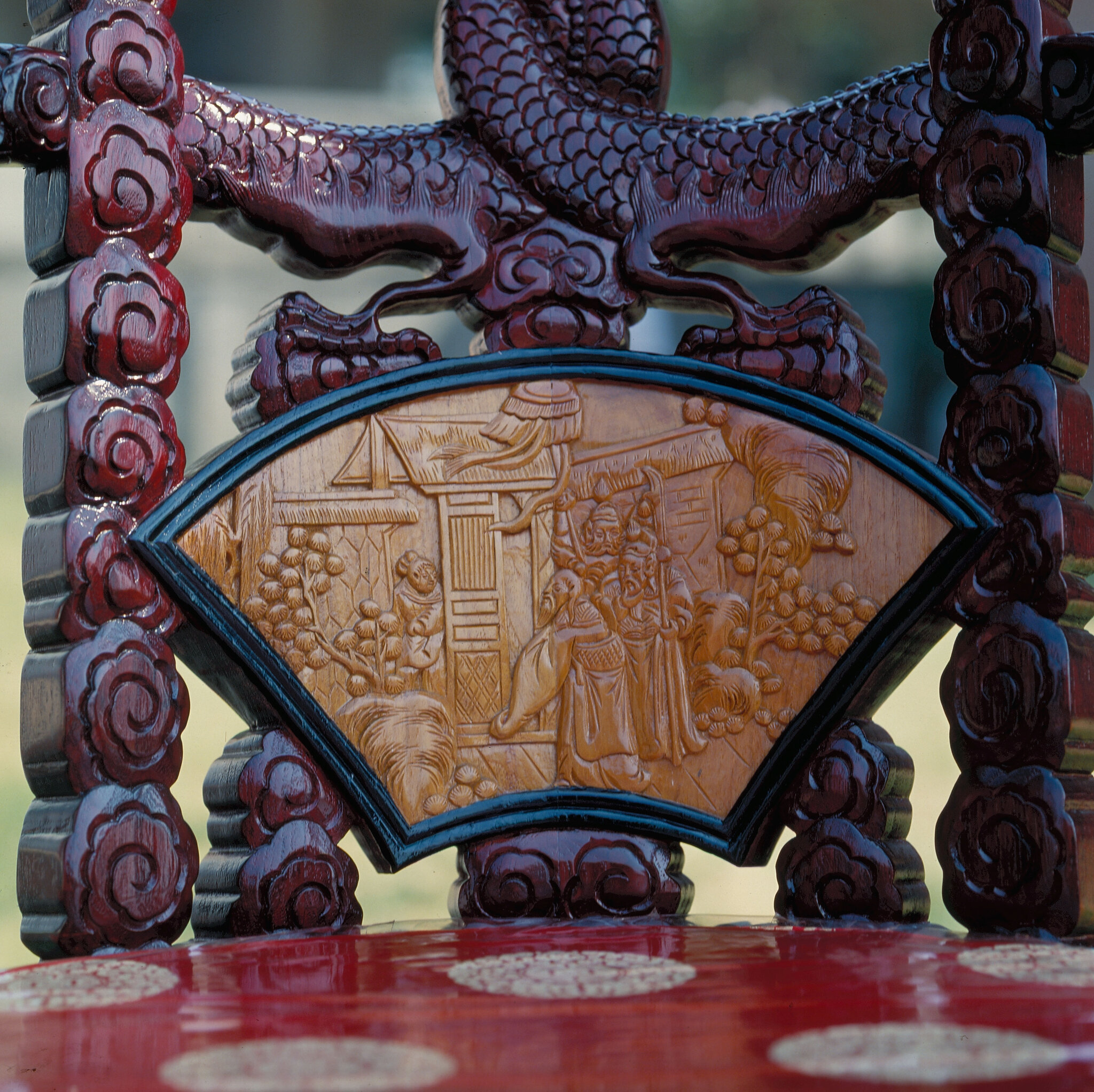 除了太師椅以外,還有神案、床、櫃、書架,甚至洗臉架等,都經由師傅一刀一鑿地雕刻製作而成,其中花紋種類繁多,有代表吉祥的龍鳳、麒麟、如意,有寓自然美於生活中的藤蔓、山水等。