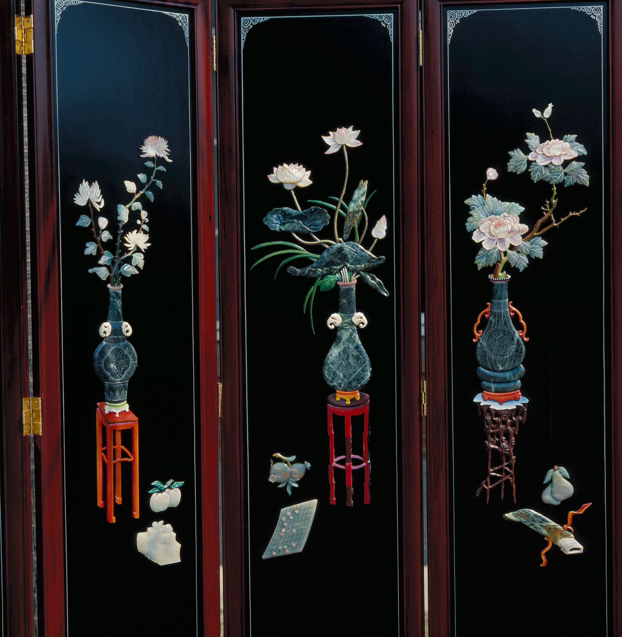 大部分的花紋都是雕刻出來的,但「鑲貝」技法也常在古式家具中看到。那是將貝殼、玉、大理石等,鑲在檀木傢具上,再磨得與木頭平,不僅色澤閃爍精美,圖案變化也較繁富。可以上述材料鑲飾出國畫山水般的景色,雲嵐群山、山峽瀑布等,據對民俗頗有研究的劉文三說,這種將自然景緻帶進生活中的意識,也是中國人「天人合一」觀念的表現。