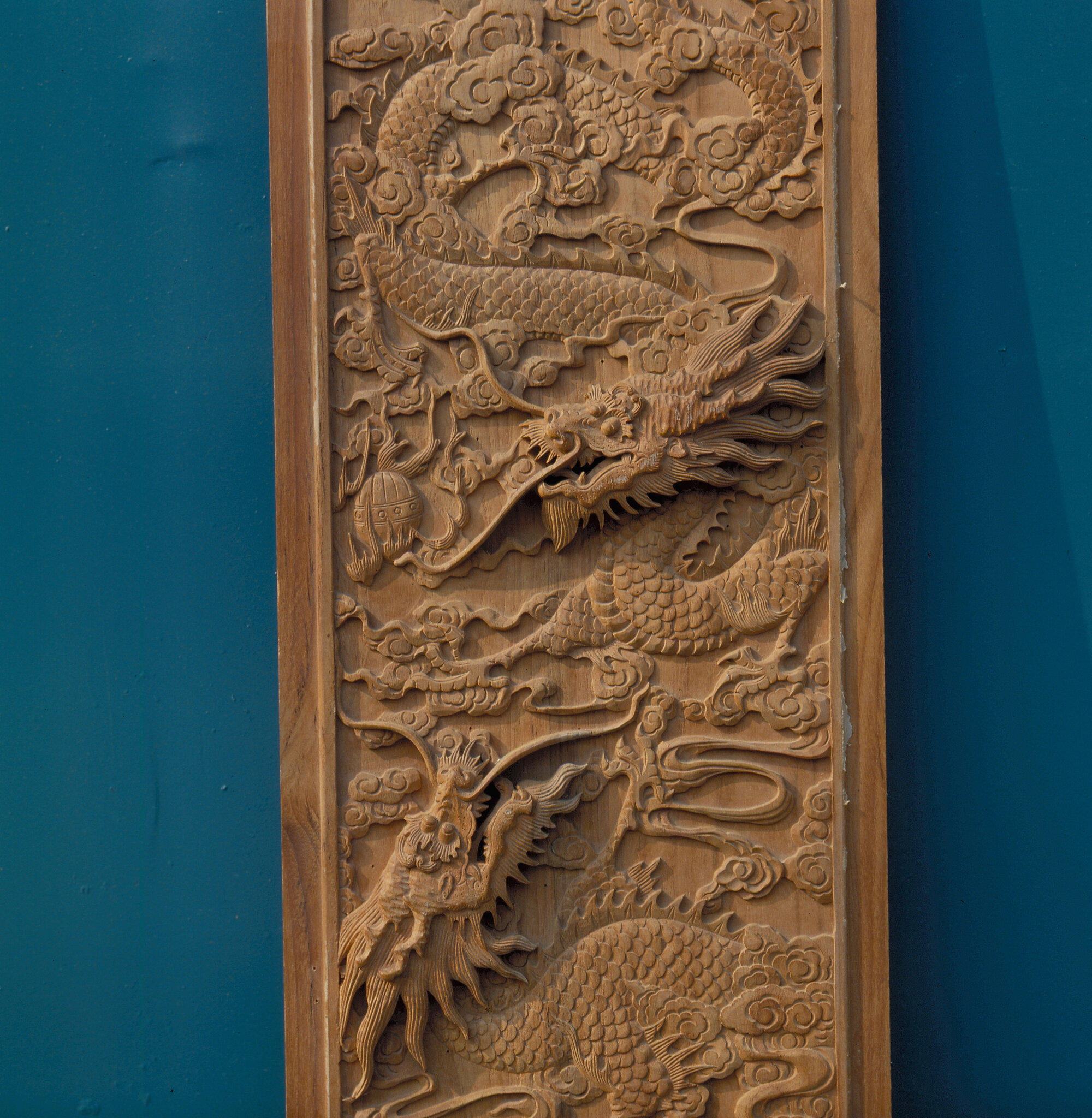代表吉祥的龍鳳花紋最常出現在木雕傢具上,這是雕好尚未上漆的部分傢具。(華台)