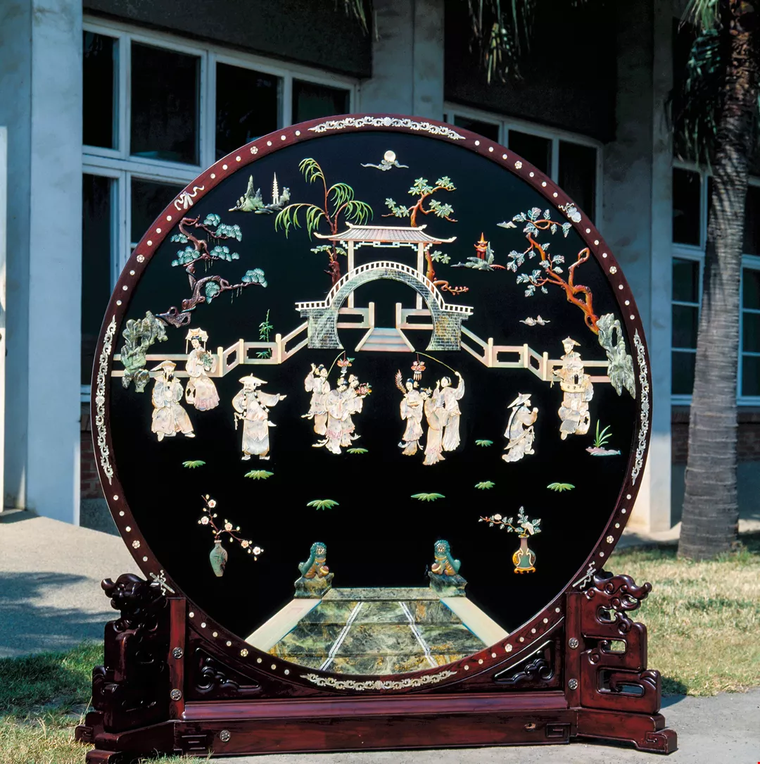 熟練的技師,在菲律賓進口的大珍珠貝上,畫上雲紋、鳥獸花鳥或仕女,利用刻刀,仔細地雕琢,再安裝到鏤空的木料上。這種細巧的鑲貝功夫,不容增一分或減一分,師傅們的手藝爐火純青,鑲貝才得天衣無縫。