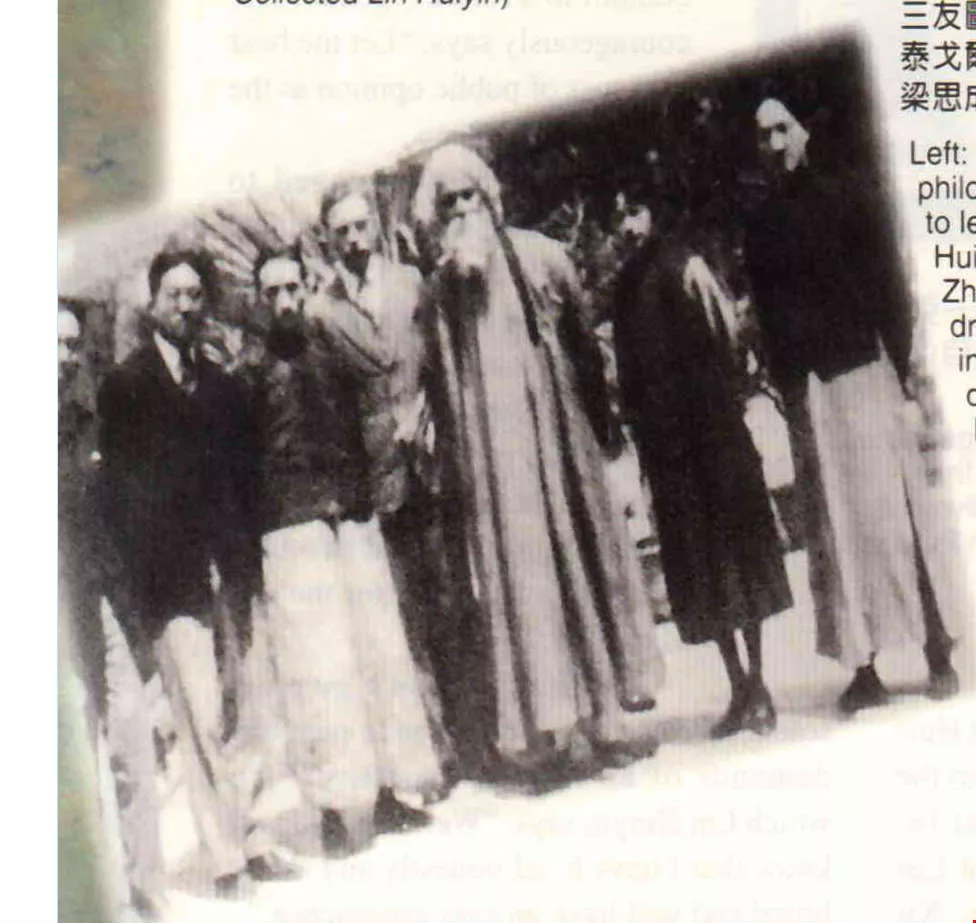 (左)一九二四年,印度詩哲泰戈爾來華訪問演講,由「人豔如花」的林徽因攙扶上台,「長袍白面、郊荒島瘦」的徐志摩擔任翻譯,當時京城有「猶如松竹梅歲寒三友圖」之說。右起人物分別為徐、林、泰戈爾、志摩英國友人恩厚之、林長民、梁思成。(取材自《林徽因文集》)(取材自《林徽因文集》)