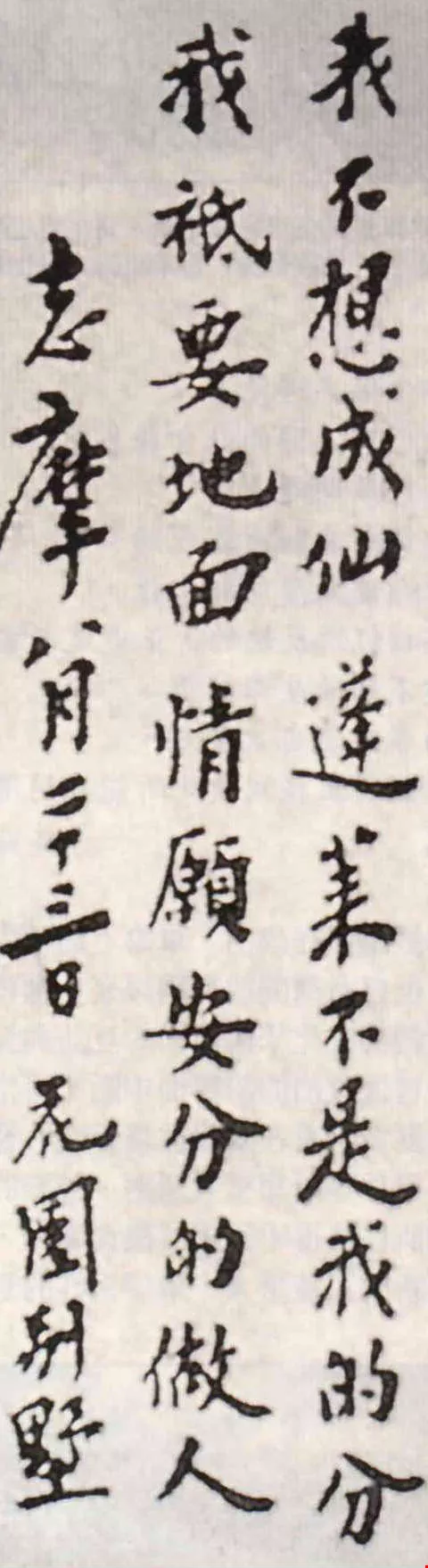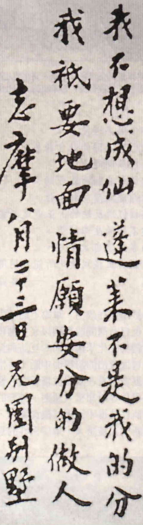 「我不想成仙 蓬萊不是我的份 我只要地面 情願安分的做人」徐志摩手跡之一。(取材自《徐志摩新傳》新潮社出版)(取材自《徐志摩新傳》新潮社出版)