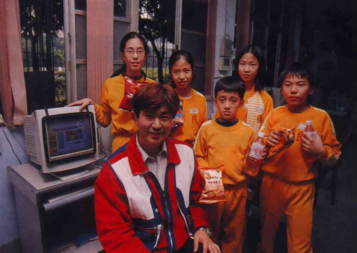北縣新莊民安國小自製了一個實習網站,銷售合作社裡的食品文具,學生一面買、一面學,是最實際的網路教育。圖為負責網站製作的洪輝光老師帶著孩子們享受線上購物的成果。(林格立攝)(林格立攝)