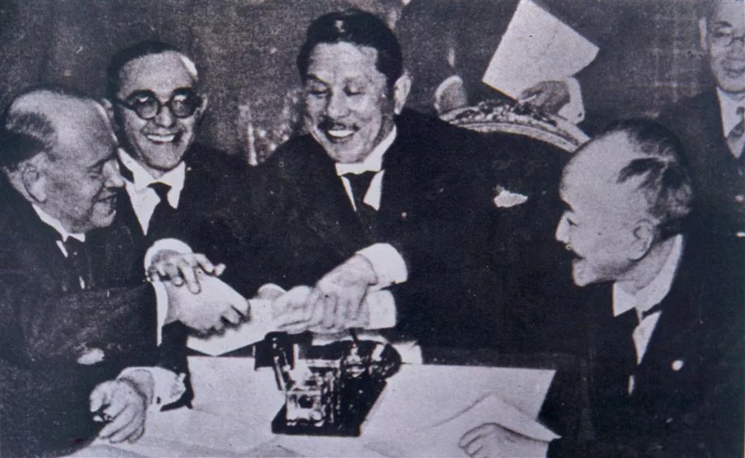 1935年3月,蘇俄未經中華民國政府同意,擅自將中國東部鐵路(the China Eastern Railway)售予偽滿,而真正的收受者當然是日本。圖為日本外交大臣Hirota和蘇俄大使及偽滿代表握手換約的一幕。(黨史會提供)