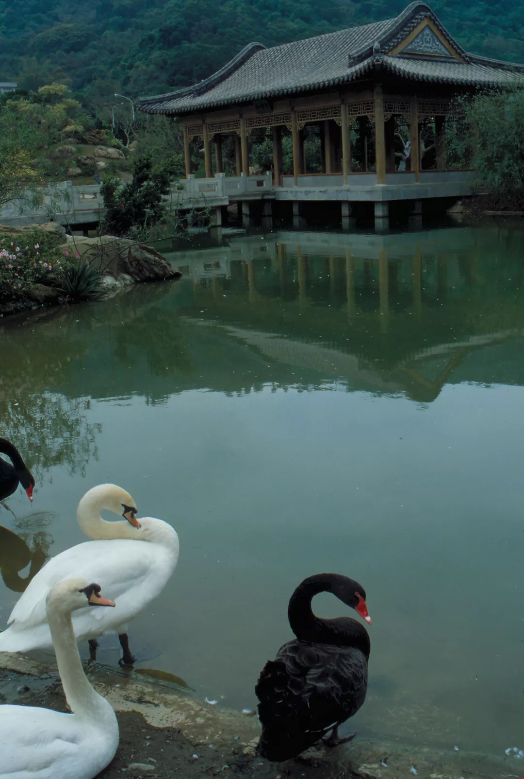 圖2.:碧橋西水榭對岸歇息的天鵝,可像王羲之的執筆之勢?(楊永山/李乾朗/黃永洪/故宮提供)