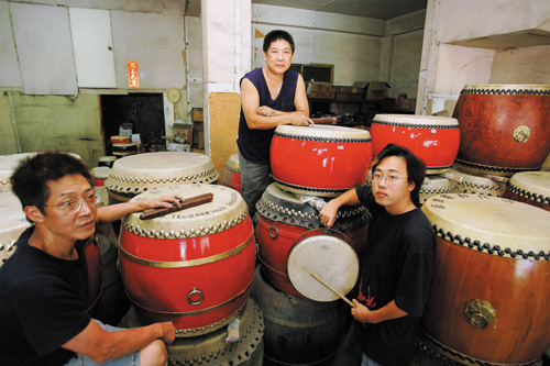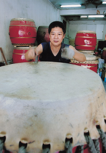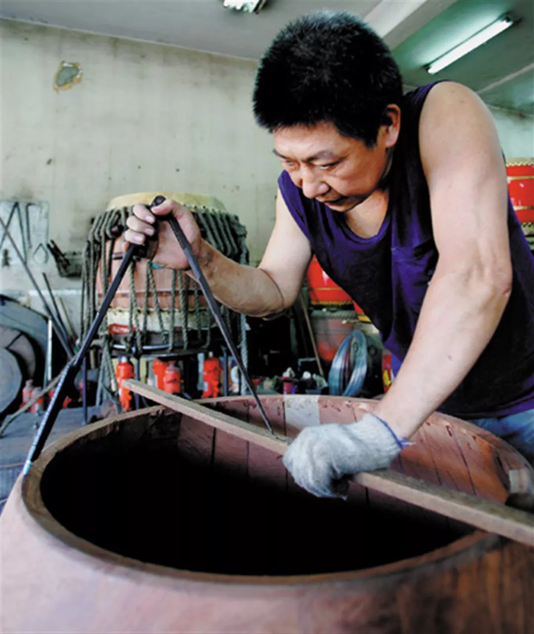 在堆滿大小鼓桶的店面裡,王錫坤認真地以鼓槌調音,一旁的助手則按照他的指示調整千斤頂,「成熟的製鼓師傅,不只聽當下擊出來的聲音,還要會預測未來的聲音;新鼓較緊,聲音比較脆亮,大約5年左右,鼓聲穩定後音色就會很『純』,通常寺廟裡的鼓,可以維持一甲子以上不需更換鼓皮。」