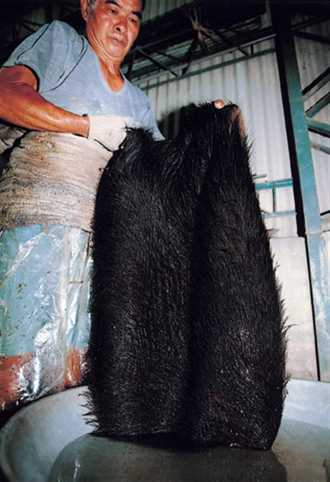 買來的牛皮依鼓面所需大小的圓弧切割、燙過後,先用單柄削刀削去牛毛和表皮,水牛皮乍看之下是灰黑色,但去掉牛毛和表皮後,卻呈現相當柔和的米白色,表面還散佈著土黃色紋路。之後再用雙柄削刀由牛皮中間向外推,慢慢削去牛皮內厚厚的脂肪層後,再削出鼓皮所需的厚度。