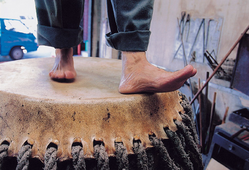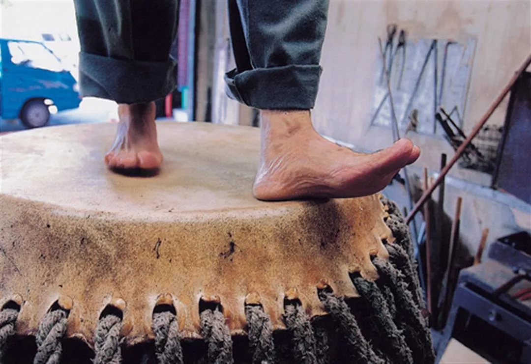 繃鼓時,為了鬆弛並軟化鼓面,必須踩鼓。
