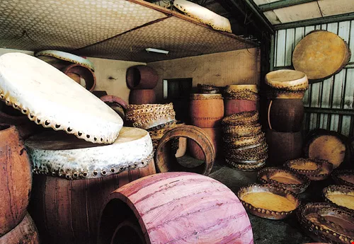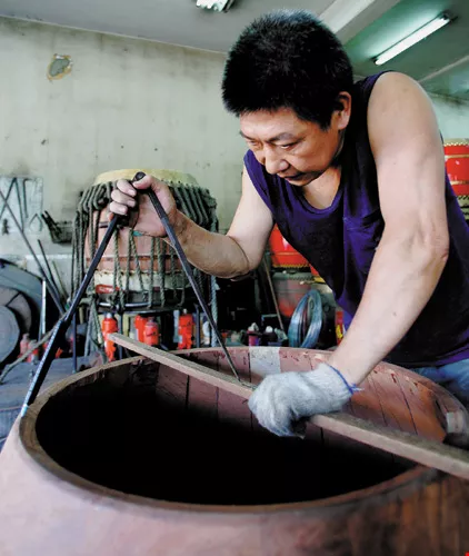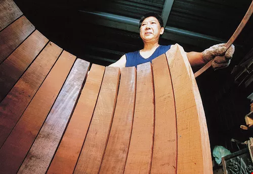 製作鼓桶時,以往師傅得自己一片片修刨向外彎曲如香蕉狀的彎度和角度,1個鼓桶需1整個工作天才能完成,費時又耗工。所幸拜科技進步之賜,現在只需將鼓桶的尺寸和角度跟木材加工廠溝通清楚,木材廠就會將木材切好,乾燥處理後送來;而且藉助機器的人工乾燥法,只需在乾燥室內放置40天,取出後再自然風乾半年左右即可,免去以往長達兩年的漫長等待。