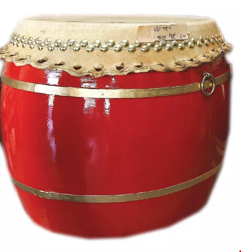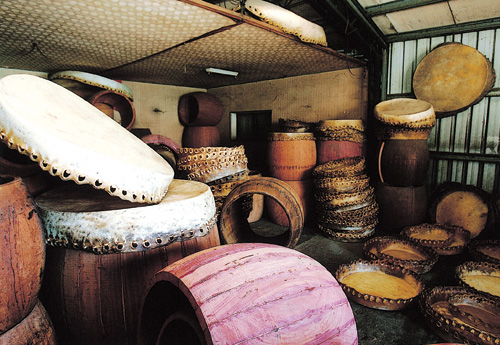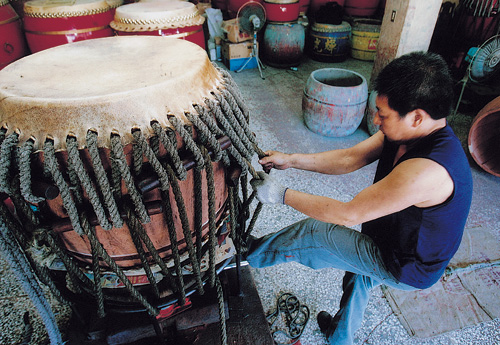 削好的鼓皮放在適當尺寸的鼓桶上後,還要用人力把鼓皮拉緊,鼓邊部分暫時以釘子固定,然後曝曬、乾燥成型。