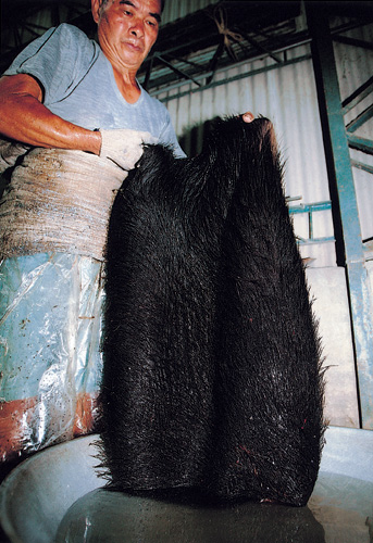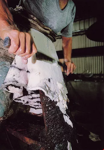 削牛皮完全靠人工,由於腥味濃又有血污,工作環境又髒又累,尤其削牛皮如果只靠蠻力,不僅牛皮會滑動,也容易因用力不當挫傷胸腔。削皮時,鼓面要薄,刀法要勻稱,音質才會準確;至於鼓面邊緣四周與繩索結合的地方要厚,才禁得起「繃鼓」時的力道,厚薄的拿捏端靠老師傅長年經驗累積,才能掌握得恰到好處。