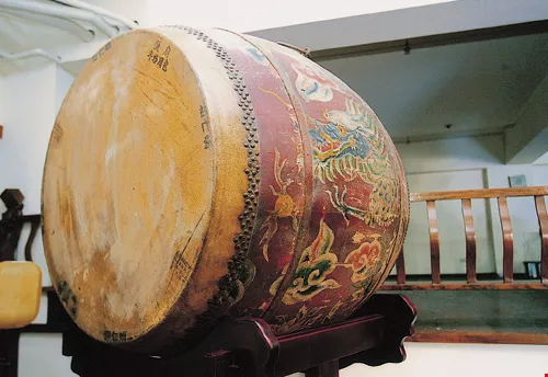 王阿塗60幾年前為台北縣永和廣濟宮所製作的大鼓,鼓聲依然渾厚響亮。