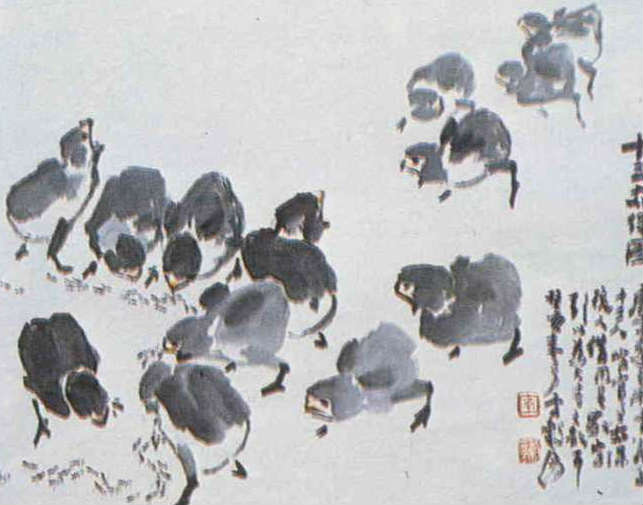 許多看過李轂摩那幅題名為「田園之歌」的人,都不禁為他的巧心慧思拍案叫絕。他以其他水墨畫家不曾用來入畫的電線桿為主題,電線上疏落有致地棲滿了麻雀。那些點墨而成的麻雀,彷彿都在吱吱喳喳地叫著;配上淡掃而出的沃野平疇、茅舍農家,田園風味躍然紙上。