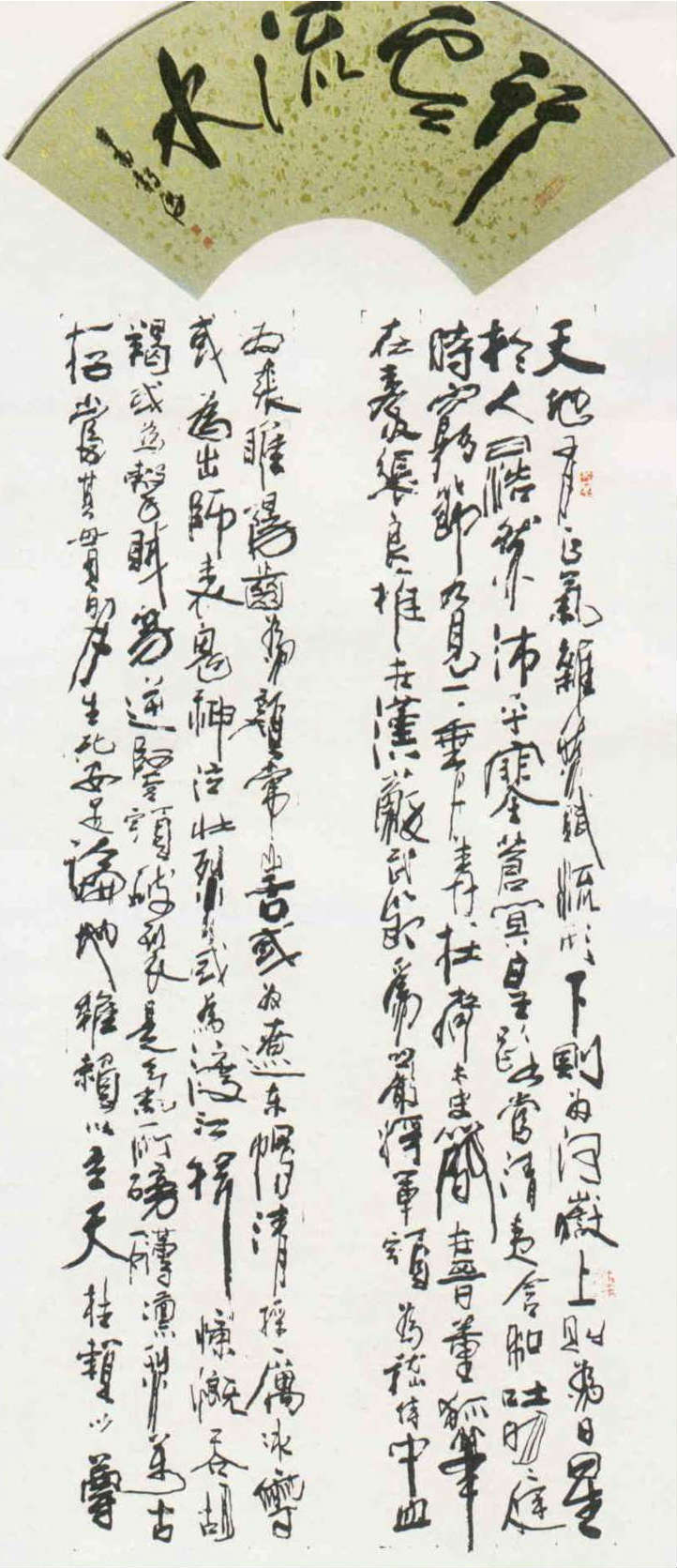 圖:李轂摩的書法,氣勢奔放,線條蒼勁,造型獨具一格。上為他題了字的扇面,下為他寫的「正氣歌」字幅。