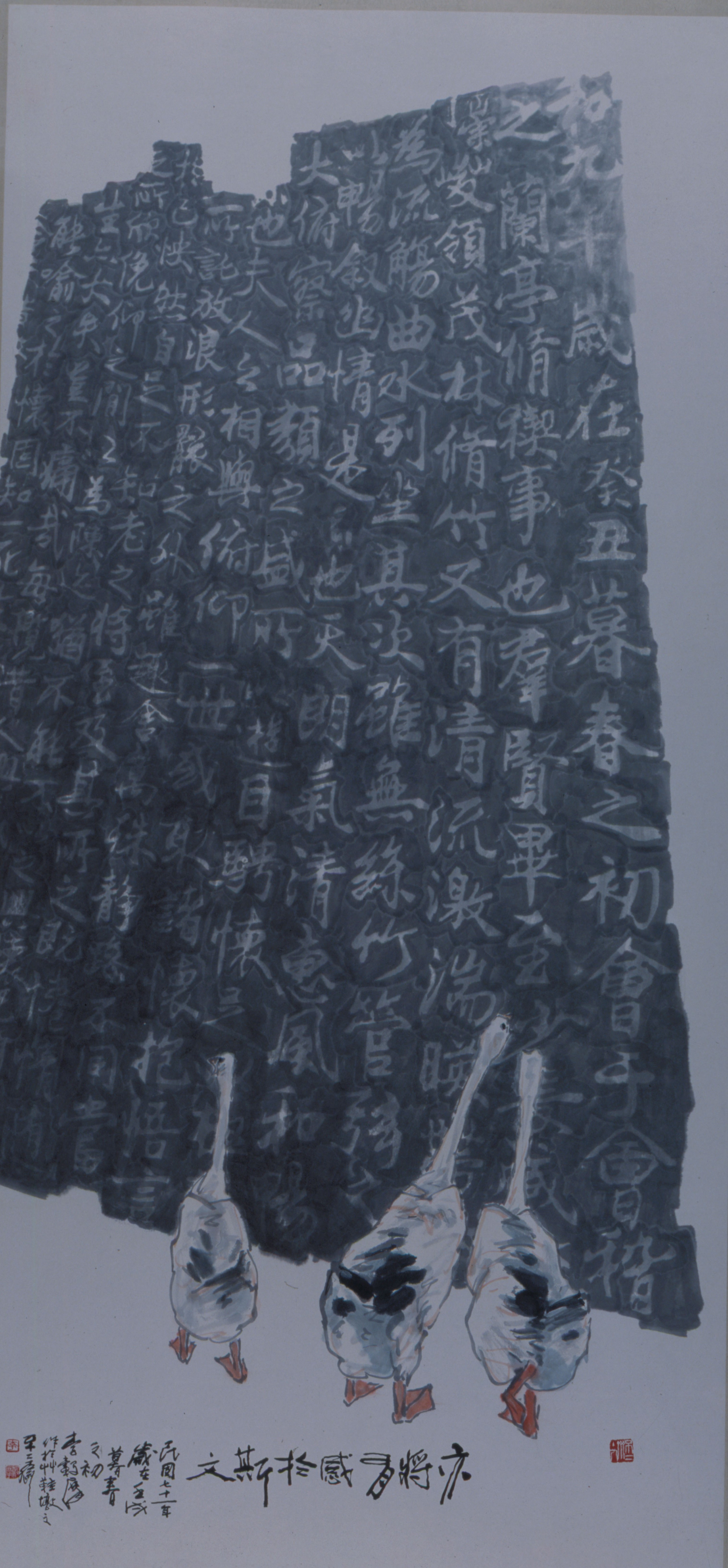 有了這個構想,李轂摩以拓碑的效果作畫,碑文是王羲之的「蘭亭集序」,碑前則是三隻引頸看著碑文的鵝,落款處題上「蘭」文的最後一句:「亦將有感於斯文」。構思之巧,題文之妙,令人讚嘆不已。這也是他至今最得意的一幅作品。