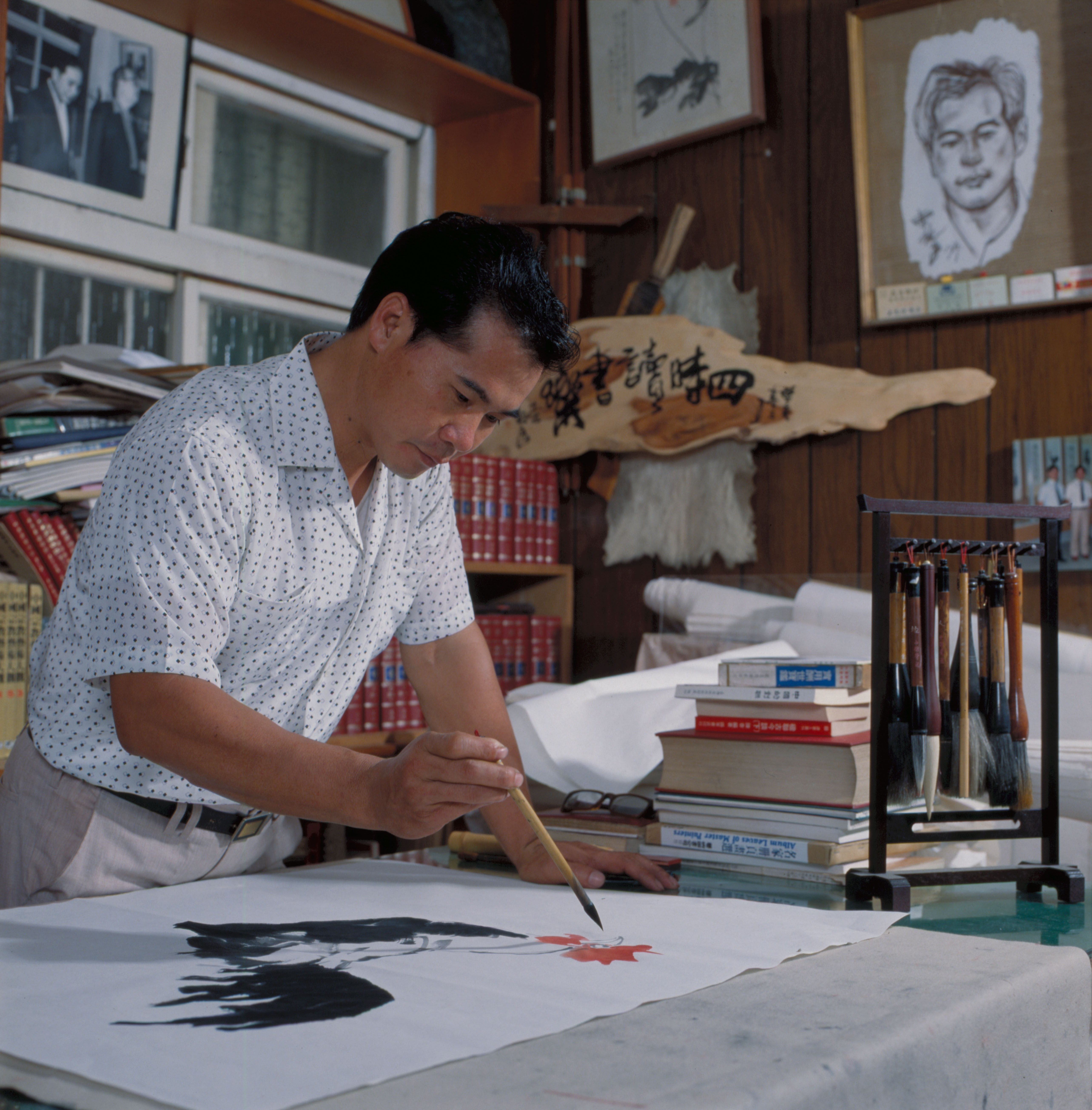當時他畫了一屋子的畫、寫了一屋子的字,掛起來自己欣賞。在艱困的物質與精神生活中,他仍執意致力於繪畫及書法的鑽研。