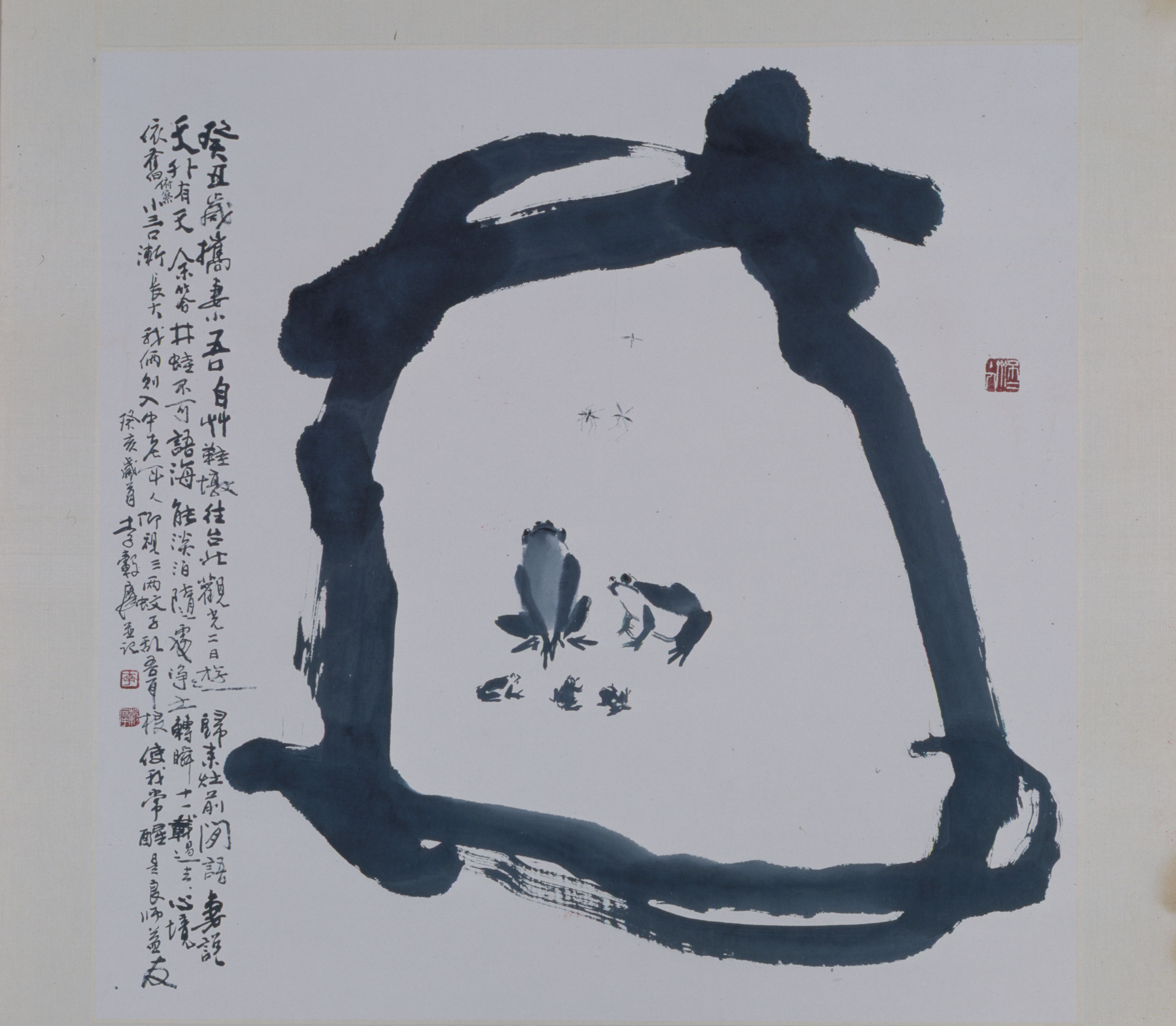 圖1:李轂摩極具巧思慧心,畫中流露豐富的幽默感。他以「井蛙」自喻,井字當中有五隻青蛙,代表李家五口。(楊永山)