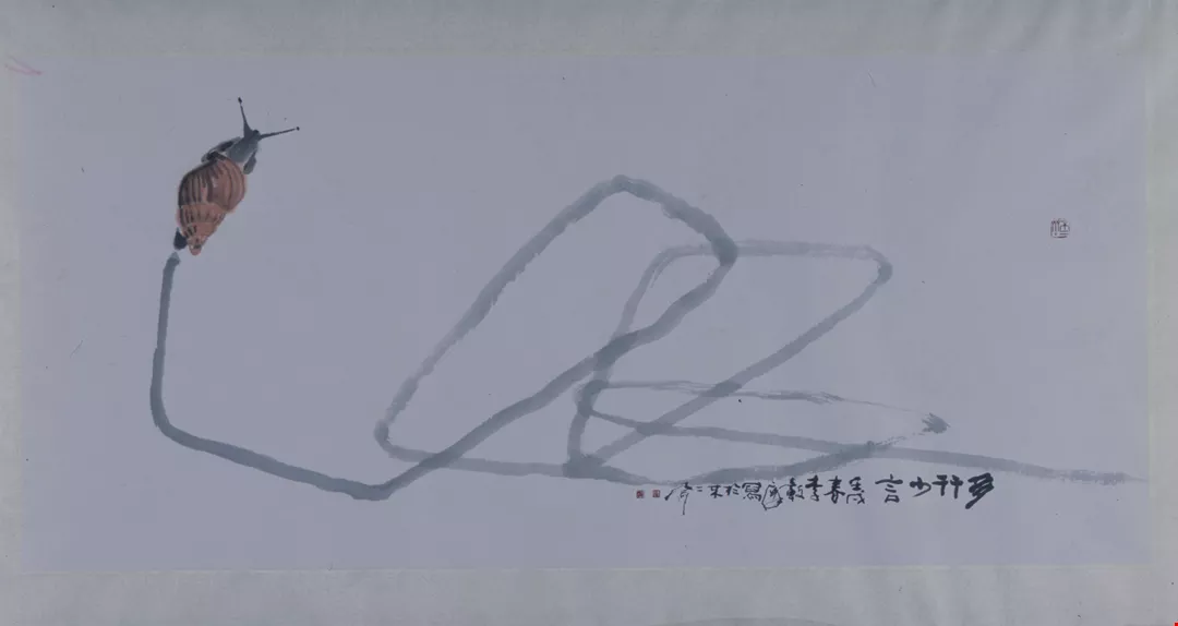 2:「少言多行」畫的是一隻緩緩獨行的蝸牛。(楊永山)