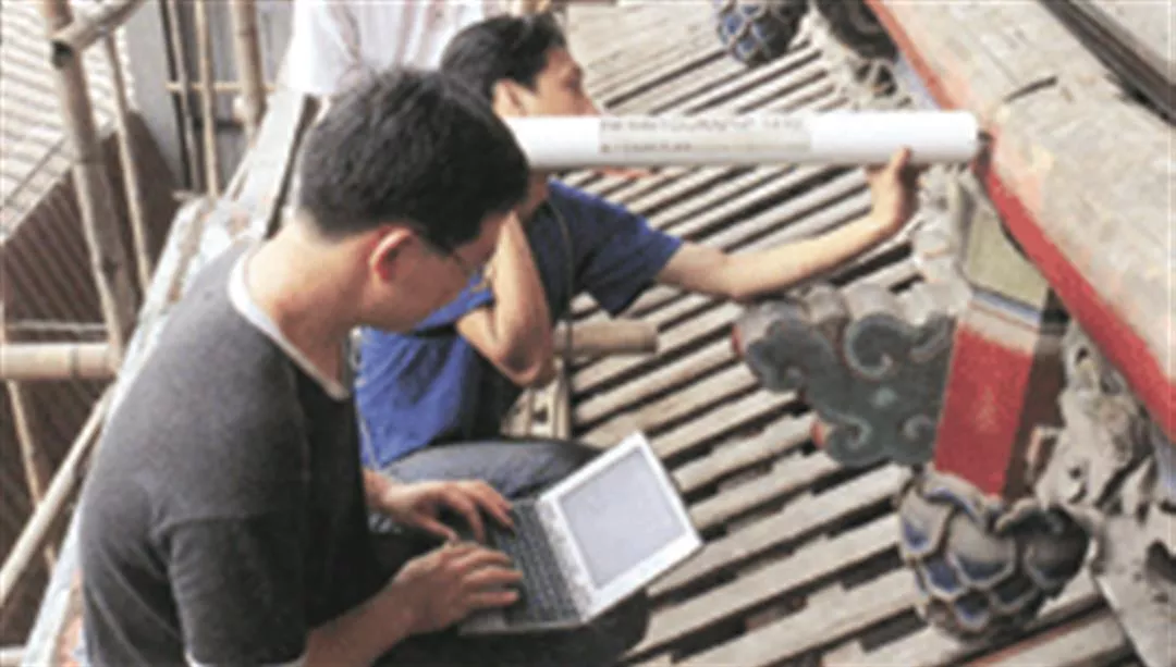 堅持傳統工藝,融入現代科技,保安宮的修護工程項目龐雜,聯合國「亞太文化資產保存獎」榮譽得之不易。圖為台灣大學森林系師生以非破壞性的超音波對舊材進行檢測。