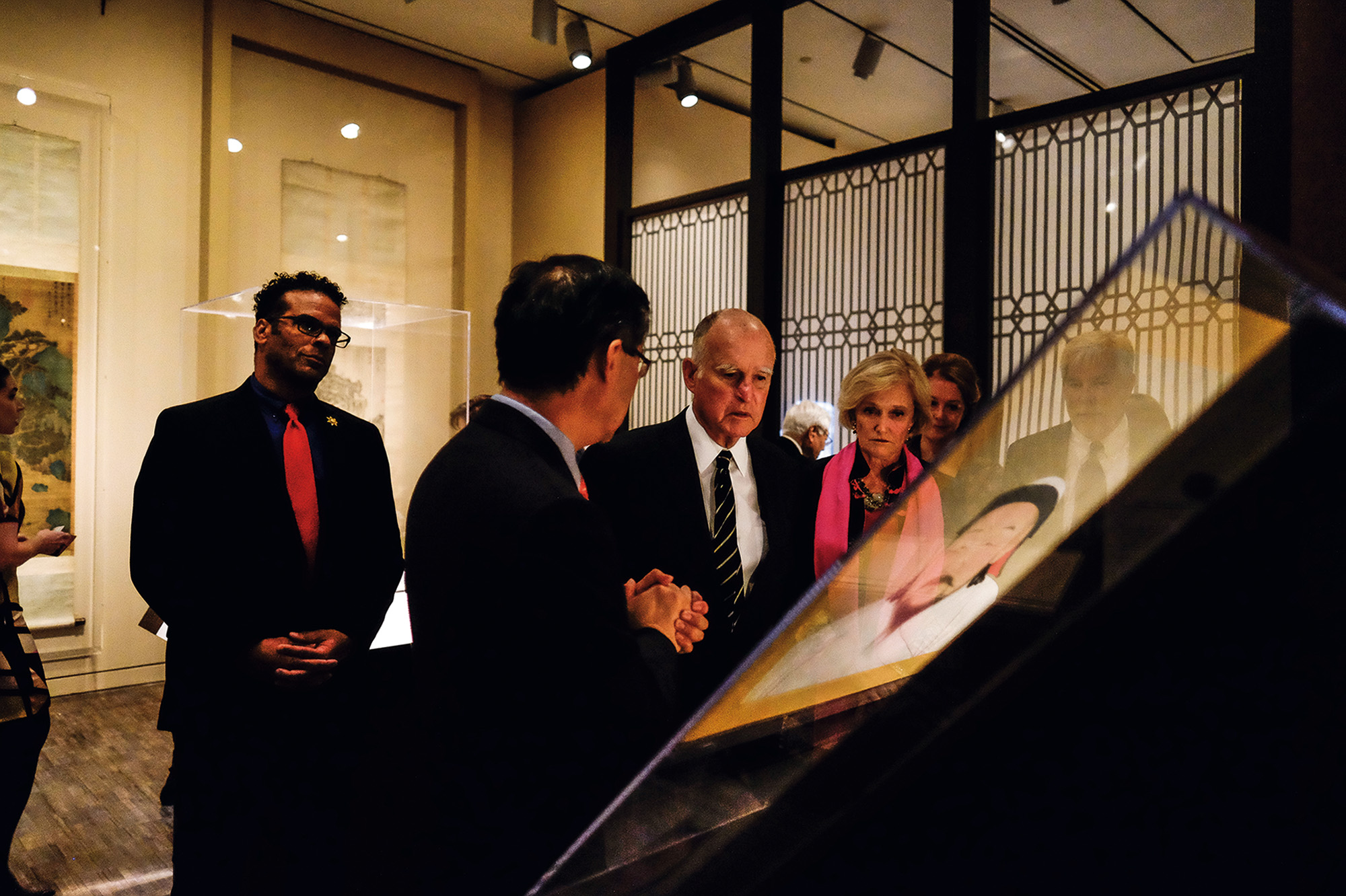 加州州長Jerry Brown(左二)親自蒞臨開幕典禮, 他對於中國古代皇帝肖像的概念相當感興趣。