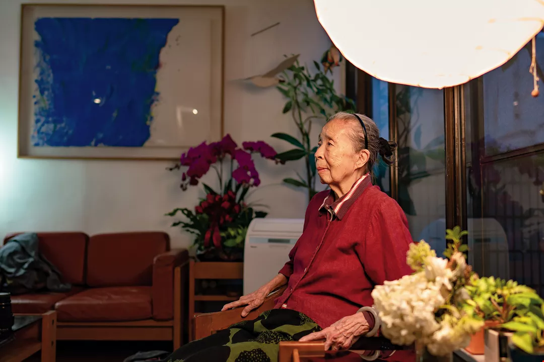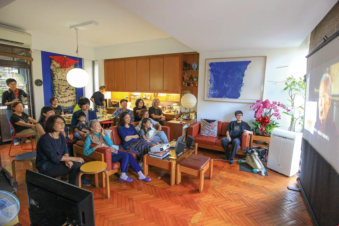 雪舍的大客廳,多年來都是許多親友聚會的場所,圖為獲頒國家文藝獎後,公視為王秋華拍攝紀錄片,播出後,導演、建築同業齊聚觀賞。(陳紹平提供)