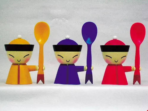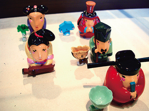 故宮文物的「古」,也能變身為「新」的流行商品。(由左至右)義大利名廠Alessi挪用清朝人物造型設計的「清先生」、寫有王羲之《蘭亭集序》的iPhone手機護套、顯影唐朝仕女體態豐腴的「妃妃杯」,以及Q版古人「時尚公仔」。
