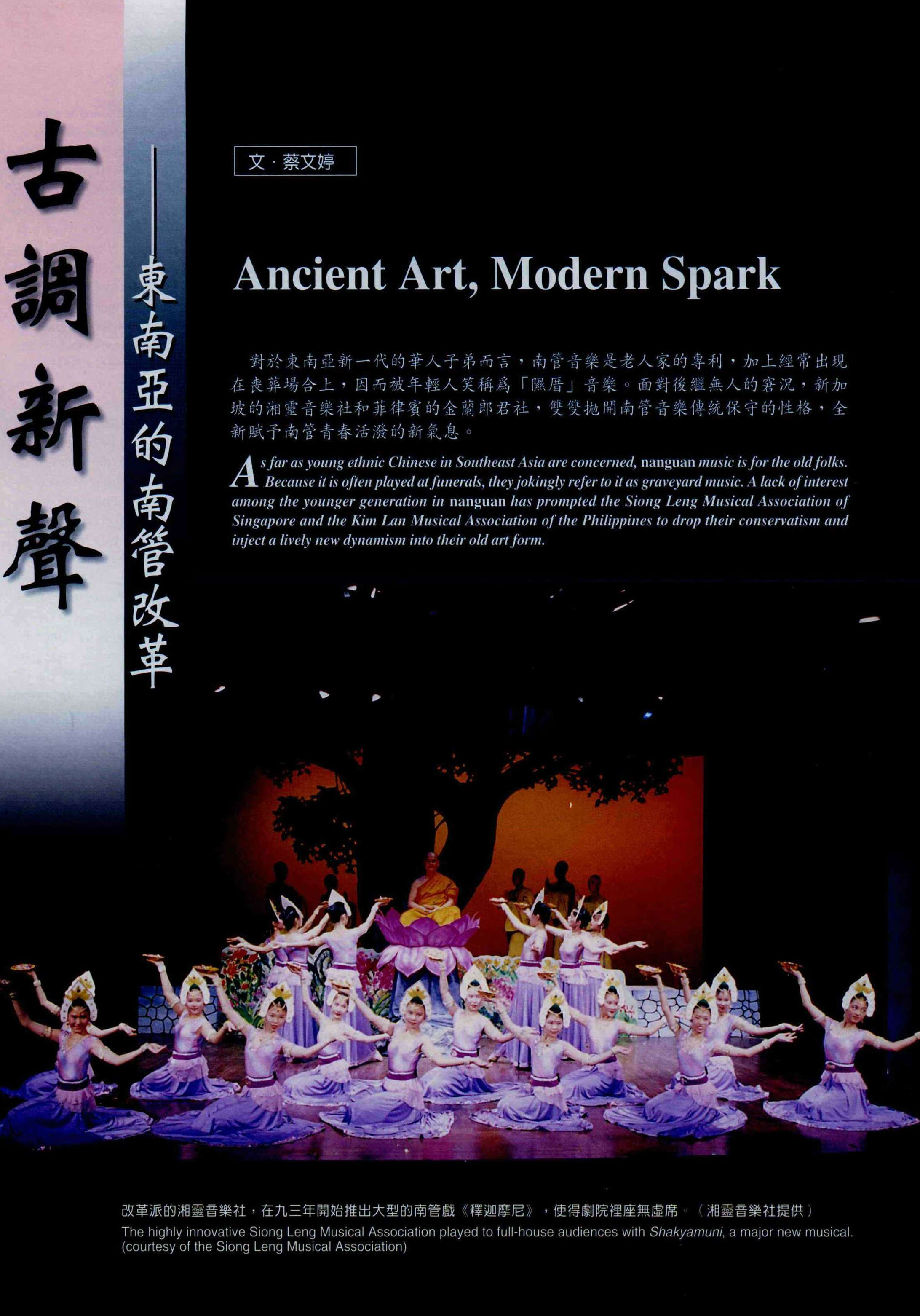 過去南管音樂總是侷限在華人社團裡,屬於老人家的專利。然而新加坡老牌的南管社團──湘靈音樂社,卻在推出大型南管戲時,出人意料地讓容納一千五百多位觀眾的黃金劇院連續三天滿座。