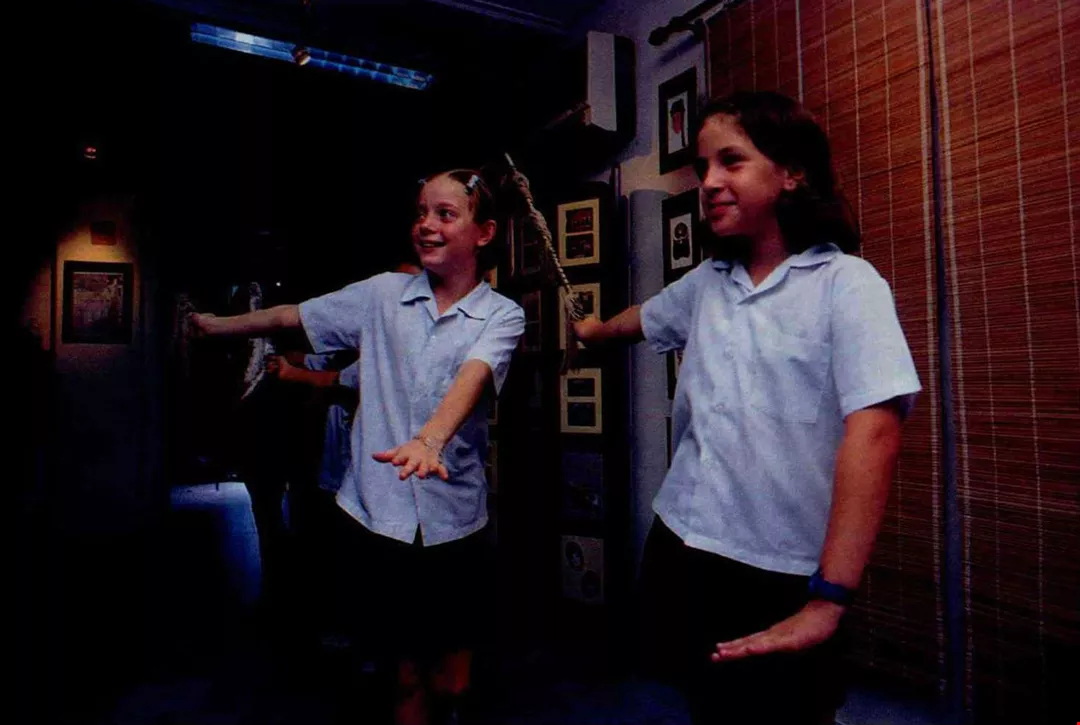古老的南管真得與年輕人絕緣嗎?你瞧!這一群新加坡加拿大小學的孩子在湘靈音樂社裡,興致勃勃地比劃身段。(卜華志攝)