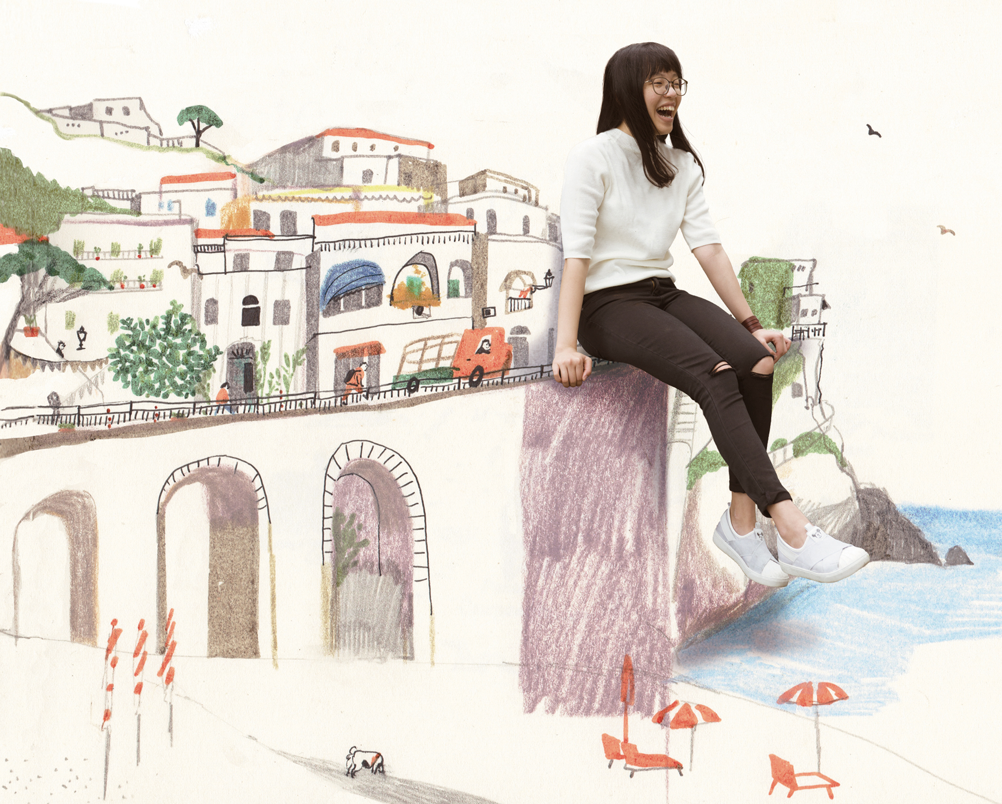 點閱吳欣芷的「Instagram」,上百張作品可見她在創作上的勤奮。隨身帶著速寫本,四處畫畫,是吳欣芷在英國養成的習慣;「less is more」,是她從英國老師那邊學到的原則。她的筆觸樸拙,色彩簡單,卻飽含情感,充滿童趣。總笑稱自己畫畫的方式很「揮灑」,吳欣芷作畫不打草稿,構圖先在腦子裡安排好,直接作畫,比較能保持自由。