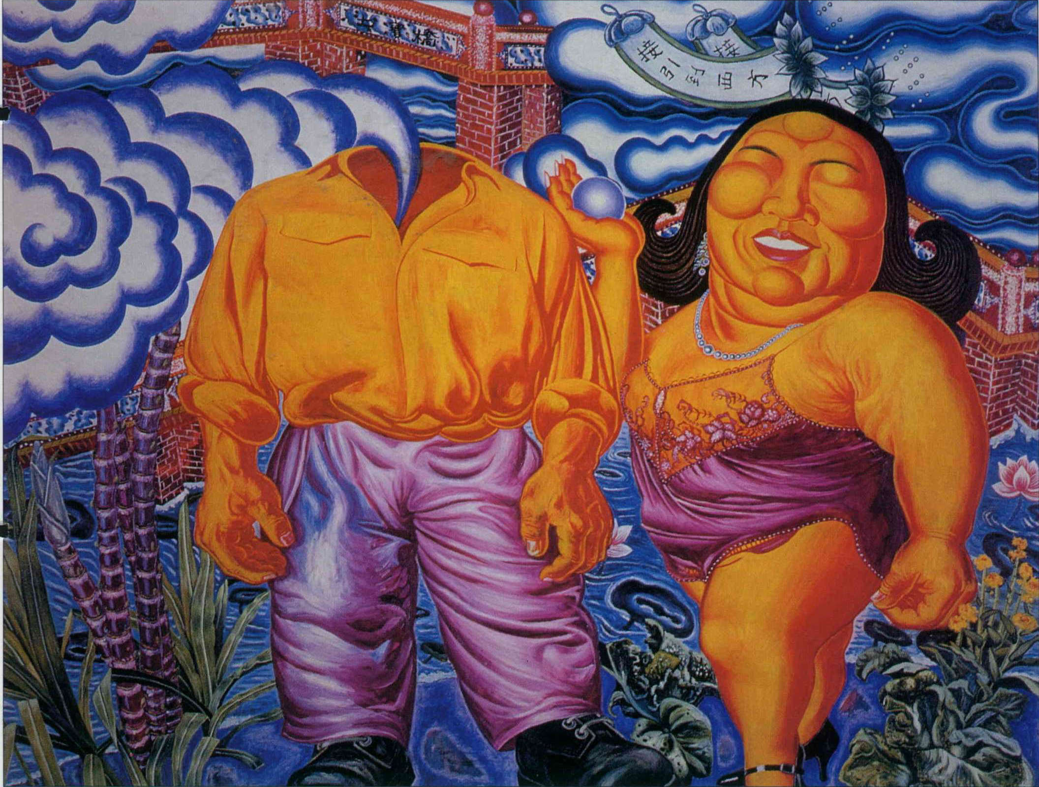 鄭在東在自畫像或家族、友人群像中,充塞著現代人怪誕和疏離的生活情態。走出都市,田園亦蕪;在中部生活的黃進河,從電子琴花車到乩童,以最俗豔的民間色彩,表現民間信俗的怪態。