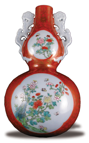 至於元代景德鎮所創燒的「釉裡紅」,則是以銅紅料(含銅化合物的顏料)在瓷胎上彩繪,然後罩上透明釉於還原氣氛中以高溫一次燒成。