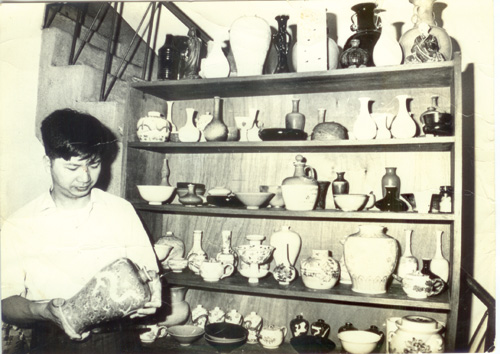 1974年,他在士林租屋處,利用約一坪大的樓梯轉角,打造第一個窯爐,並燒出第一件仿古作品「寶石紅釉杯」。為了試探市場性,他帶著作品到古董街尋求鑑賞,因評價極高,索求作品者日眾,不但強化他持續創作的信心,也更致力於釉藥研究。