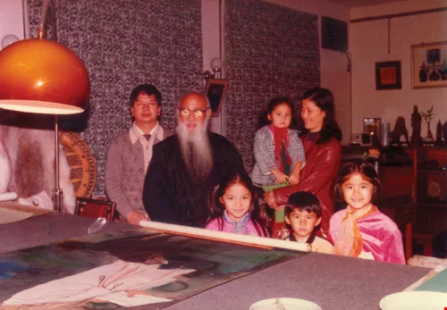 「造形優美,用色精準,高雅古緻」,這是大千居士對蔡曉芳的評語。圖為蔡曉芳全家與張大千合影於摩耶精舍。