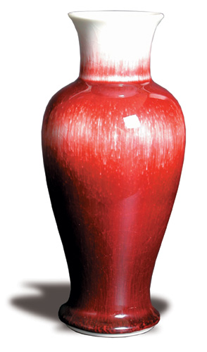 郎窯紅的最大特點是器物口部呈淡白色,而愈往下色澤愈顯晶瑩絢爛,釉料呈現自然流淌狀,而於器物的底部(足際)停止,不至流入足底,故有「脫口、垂足、郎不流」的說法。由於紅釉瓷的釉色既豐腴濃烈又輕柔嫵媚,自古即為藏家夢寐以求的珍品。