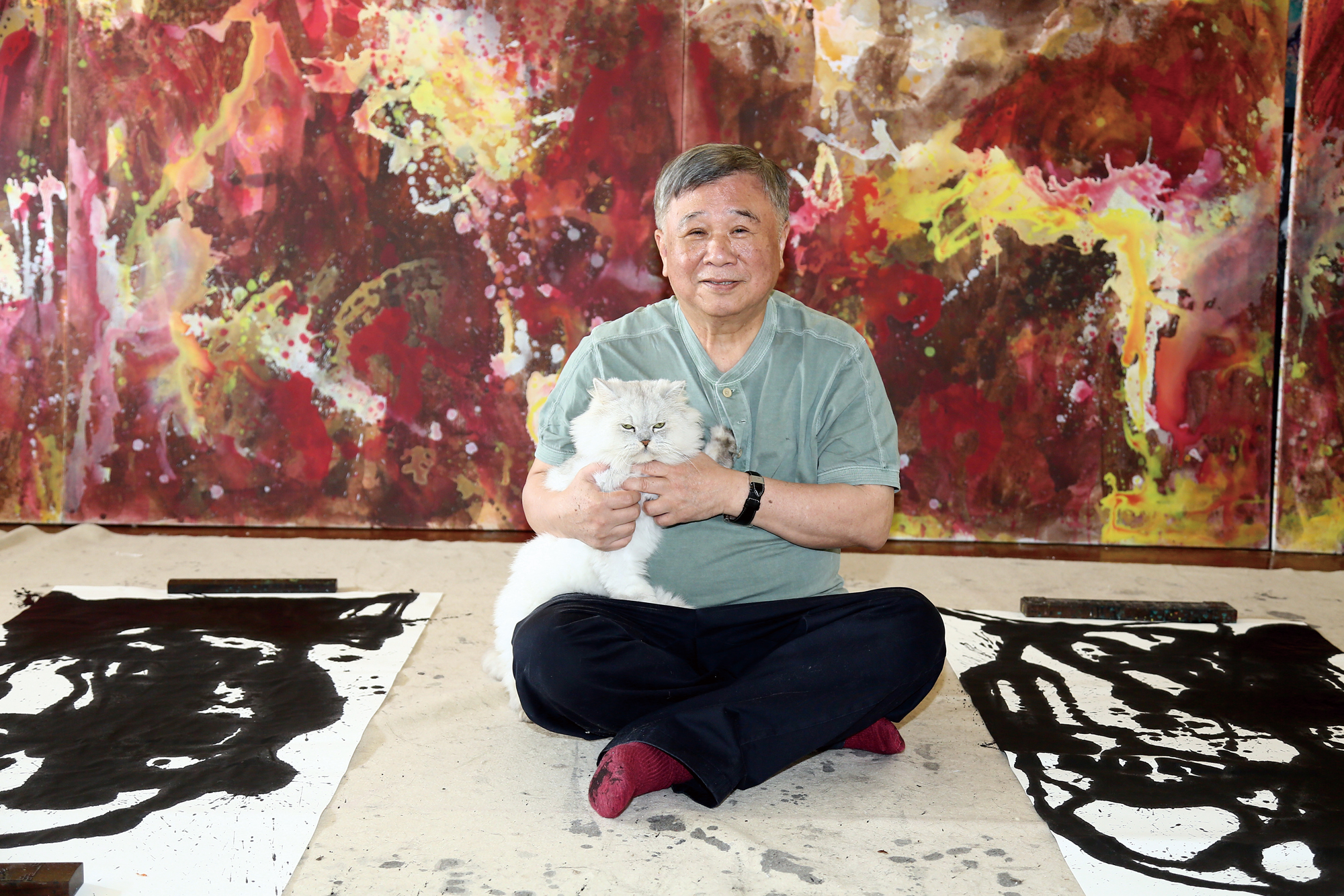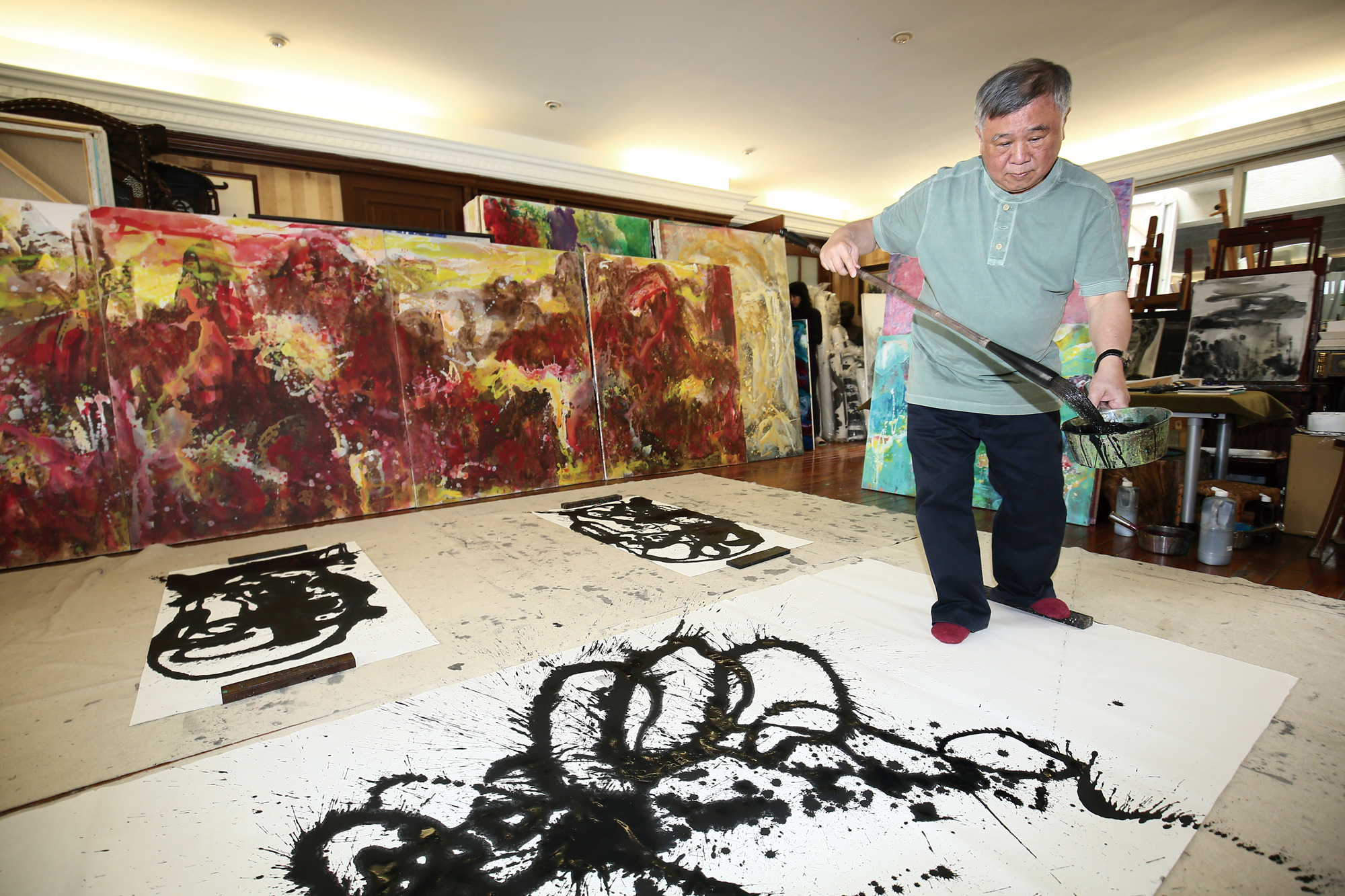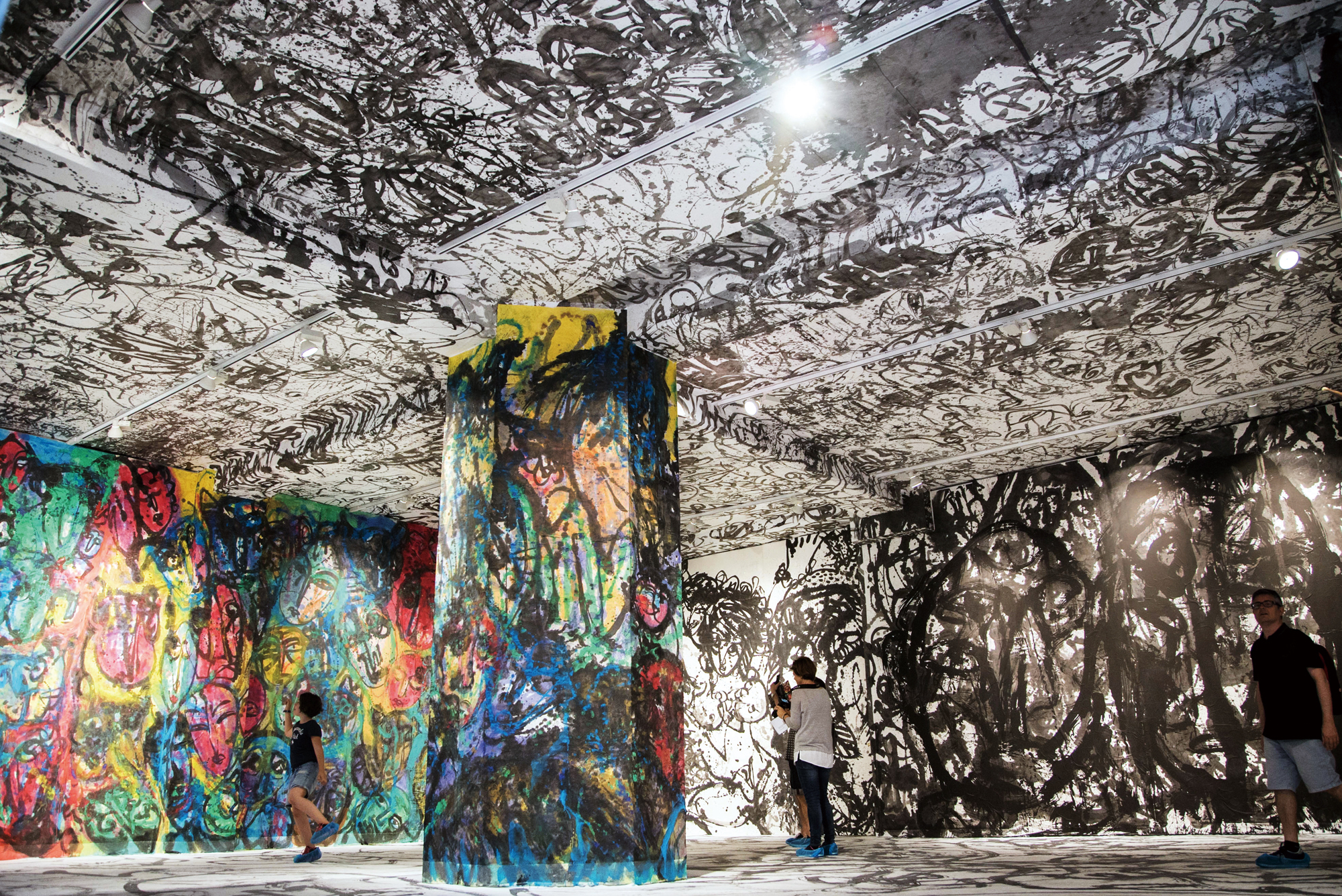 2015年威尼斯雙年展,張耀煌以「蒼生問」為主題,在展覽現場揮毫創作,天花板、牆壁、窗戶和地板,整個空間充滿視覺張力的畫作,驚豔國際藝壇。(張耀煌提供)