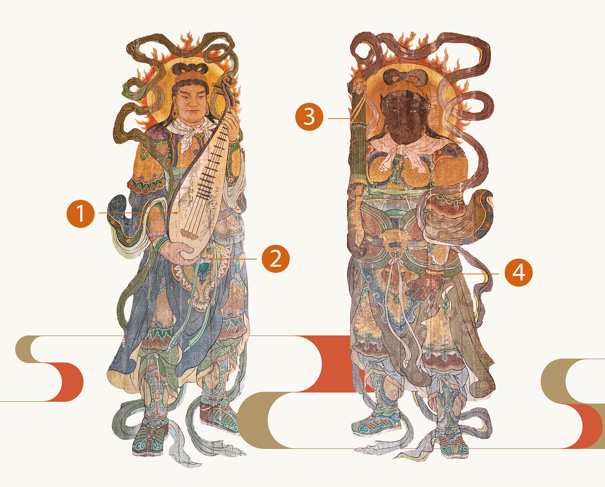 看「門」道: 解碼台灣門神 文‧鄧慧純 圖‧林格立 2026 2月 EN 分享: 秦叔寶和尉遲恭是台灣最常見的門神 芝山巖惠濟宮,卓福田繪。 尉遲恭,面如焦炭,持鞭 1. 門神的頭身比例通常是七頭身。 2. 鬍鬚的畫法展現畫師的功力。最好要看來柔軟纖細,彷彿在飄動,還能隱約看見後面服飾的紋樣,表現出空間感。 3. 武門神,常見身穿文武甲,結合文官袍與戰甲,隱喻其文武雙全。 4. 眼睛和表情是門神畫成敗的關鍵。 5. 龜與仙鶴,代表長壽。 6. 武門神有時會一位佩弓,另一位佩劍袋,意味要協力合作禦敵。秦叔寶,粉面,持金 1. 鬍鬚的作用,可以作為年齡的識別,黑鬚是壯年,白鬚是老人。無鬚手持拂塵者則是宦官。 2. 畫師完成作品後,最常見在箭套上署名,寫下完成的年份;偶爾也見在武器上落款。還有畫師會寫上聯絡電話,藉此宣傳。 3. 武門神常見丁字步的站姿,帶著一種隨時準備出擊的動感。 4. 「四顧眼」是府城廟宇畫師畫眼神常用的表現手法。將門神的眼睛畫活了,讓人不管從哪個角度看,都有被目光追隨的感覺。 5. 魚,意指有餘。 6. 八仙代表慶壽、快樂和逍遙。 四大天王是佛寺常見的護衛門神 四大天王合組起來,突顯其司「風、調、雨、順」之職。 台南開元寺,蔡草如繪。 (左)東方持國天王,粉面。(右)北方多聞天王,深棕色的臉。 1. 手捧四絃琵琶,意指「調」。 2. 虎,可鎮煞驅邪。 3. 手拿渾元傘,意喻「雨」。 4. 豹,可鎮煞驅邪。(左)南方增長天王,面呈暗青色。(右)西方廣目天王,面紅。 1. 手持青雲劍,音同「風」。 2. 象,可鎮煞驅邪。 3. 手纏小龍或滑順的花狐貂,取其「順」。4. 獅,可鎮煞驅邪。 陪侍的文官、太監、宮娥 芝山巖惠濟宮,陳壽彝繪。 門神也玩諧音哏,門道是要看手中拿的器物。 冠帽取「官」的諧音,鹿與「祿」諧音,兩者在一起即為「加官進祿」。 大龍峒保安宮,劉家正繪。 牡丹花象徵「花開富貴」,爵為酒器,意指「晉爵」,合一則為「富貴晉爵」。 關鍵字: 寺廟 門神 門道 四顧眼 秦叔寶 尉遲恭 加官進祿 富貴晉爵 風調雨順 四大天王 技藝 藝術 繪畫 歷史 文化 傳統 分享: