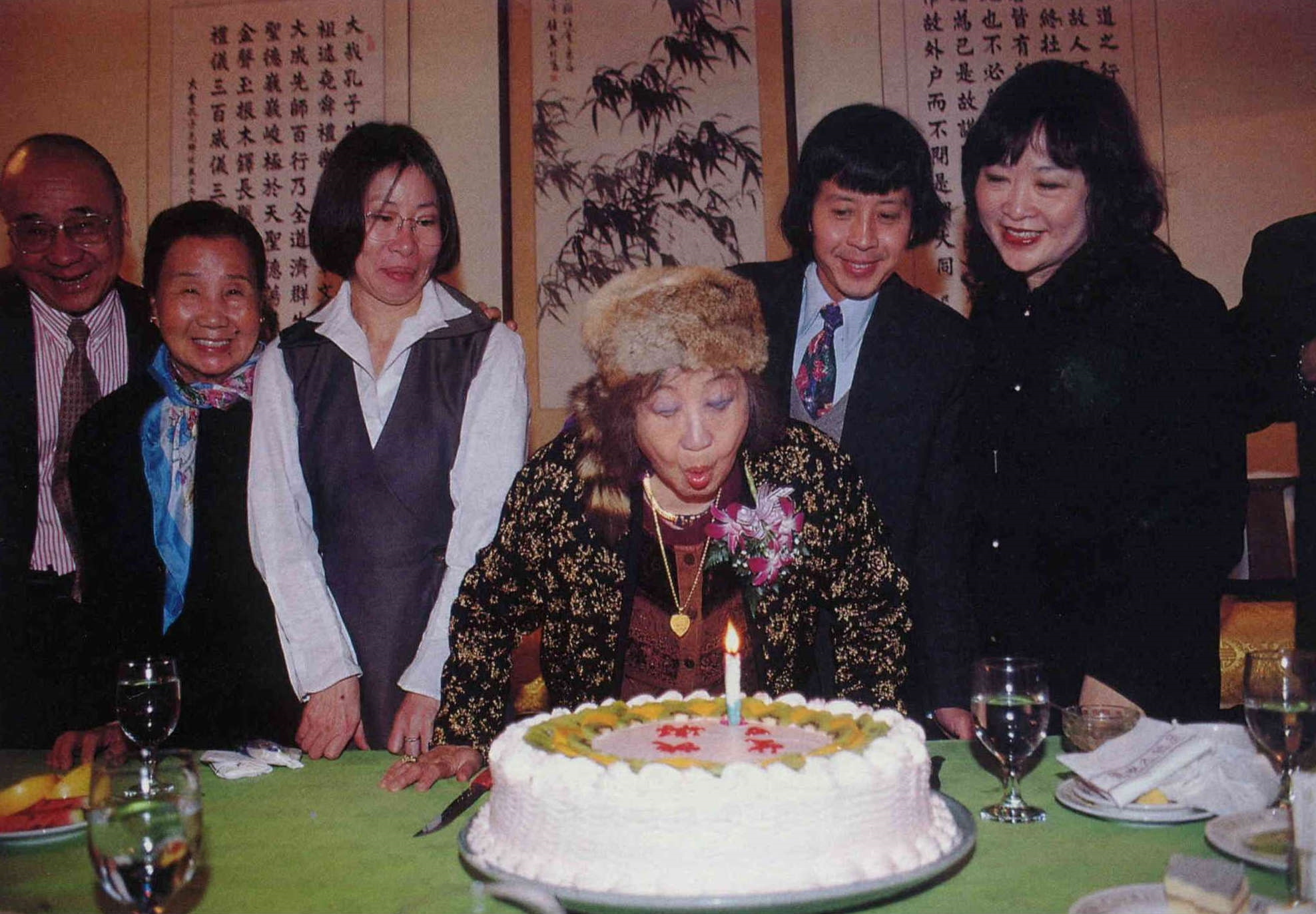 去國多年,在兒子雷大鵬(右二)與媳婦蕭渥廷(左三)的相伴下,蔡瑞月開心的參加學生們為她舉辦的慶生會。